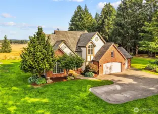 New Price! Welcome to this thriving homestead with the perfect blend of traditional charm & modern amenities. Live off the land w/ sustainable farm-life on this 3.6 acre property nestled in a gated neighborhood surrounded by country simplicity. Gorgeous 2899 SqFt home invites you into a great room w/ cathedral ceilings, brick fireplaces, formal dining, open chef's dream kitchen & 4 spacious rooms upstairs including primary suite with jetted tub, 2 large closets & french-doors w/ balcony. Custom Brazilian hardwood deck & manicured grounds are perfect for entertaining w/ stunning views of Mt Rainier. Stoll through carefully curated groves, gardens & orchards bearing 13 kinds of fruits. Fenced pasture area and barn/shop with power for hobbies.