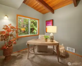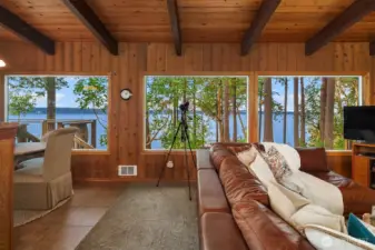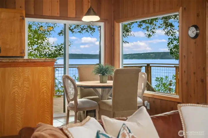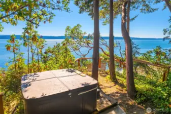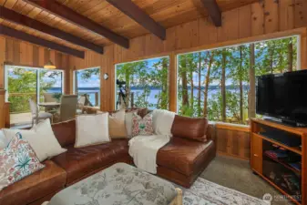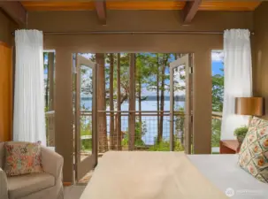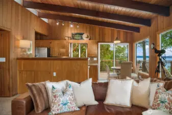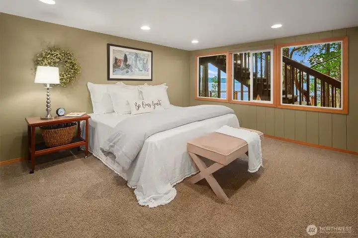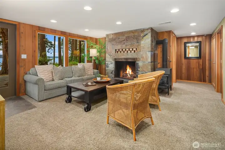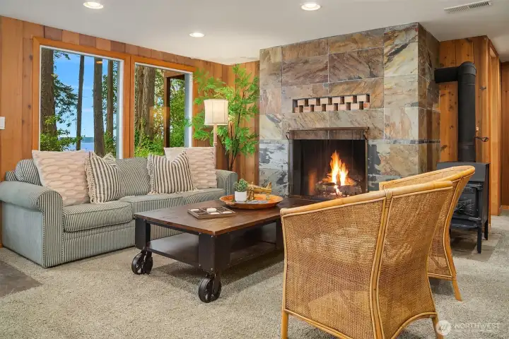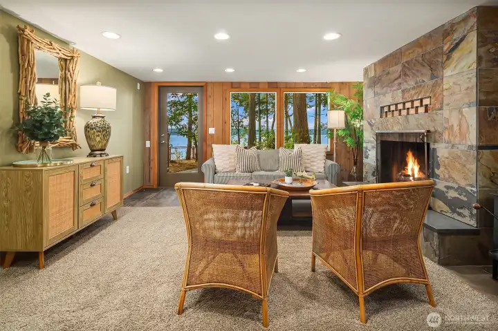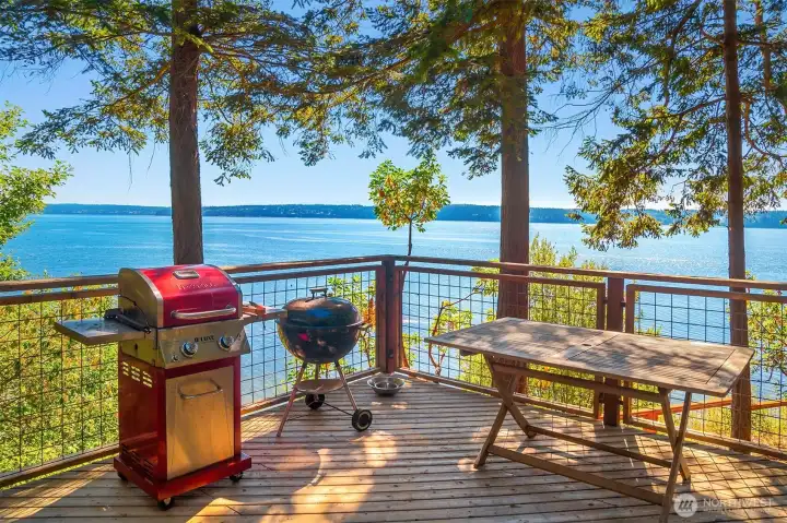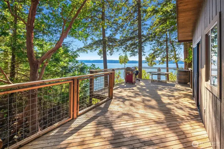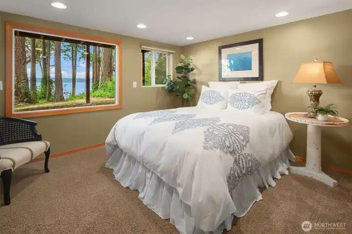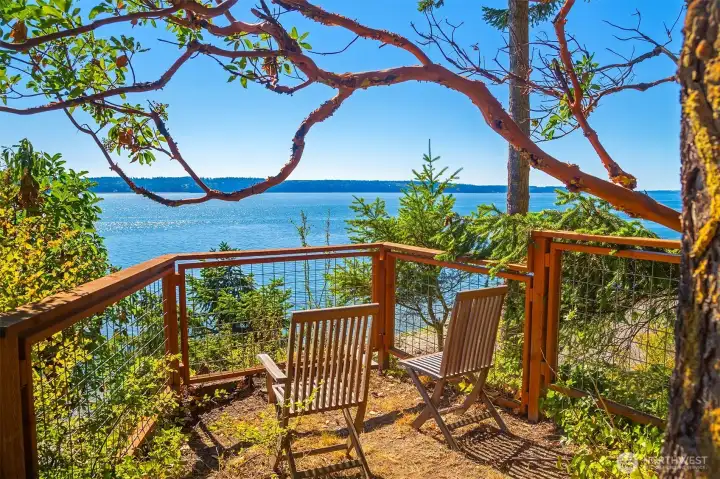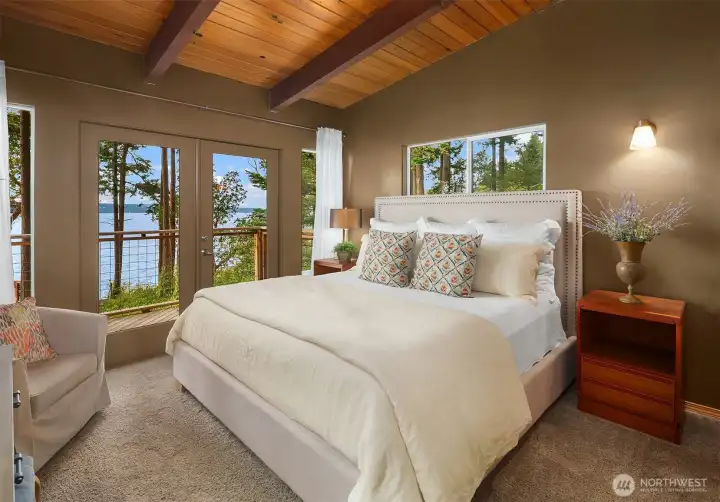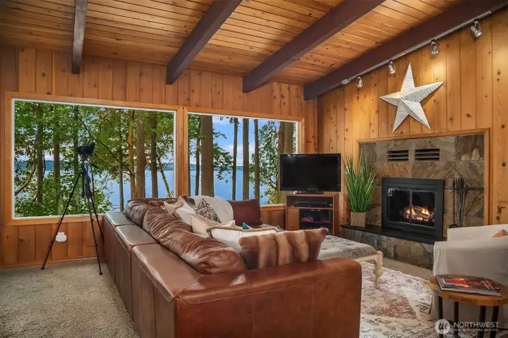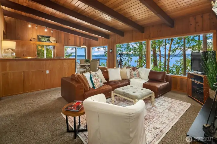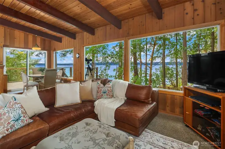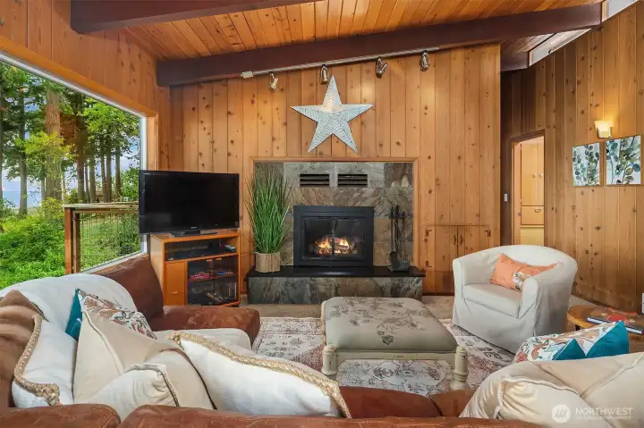 This medium bank waterfront on Camano’s west side has a true retreat feel, with panoramic views of Saratoga Passage, the Olympics, and stunning sunsets. Watch eagles, marine life, and boat traffic. Surrounded by incredible Madrona Trees and shady evergreens, the back lawn paradise offers stone walkways, patios, and a fire-pit. Wood decks off the kitchen and primary suite feature coordinated custom railings. A mid-century modern with signature Camano flair—wood-clad ceilings, warm finishes, and timeless design. Main floor includes primary bedroom, guest room/office, and bath along with living area, fireplace, kitchen and laundry; daylight basement adds family room, two guest rooms, bath, and storage. Easy trail walk to the beach!