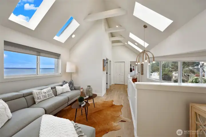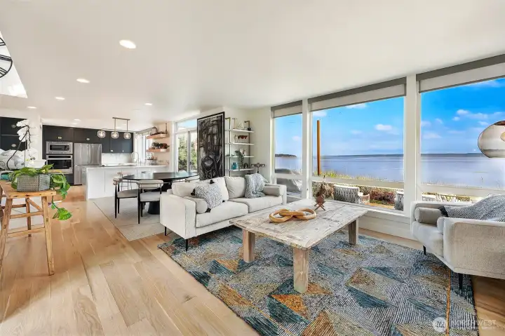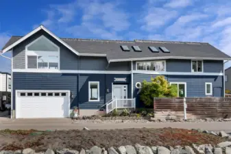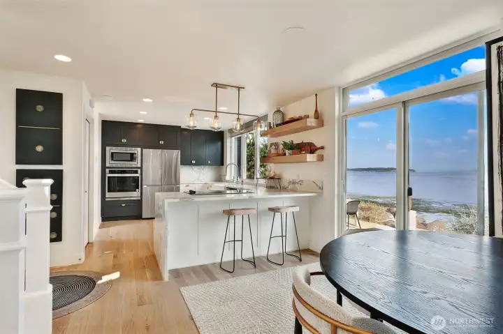 Double waterfront with views for days. Modern elegance meets coastal vibe. This lightfilled and newly updated home has floor to ceiling windows and features an all-new kitchen, bathrooms, laundry, with new custom hardwoods throughout. Upstairs you’ll find a spacious primary suite with private balcony and high ceilings, huge second bedroom, and a versatile bonus area. All custom closets. And water! 200 ft of waterfront: 100 feet of bulkhead beachfront with views of the shipping lanes and mountains + an additional 100 ft on the lagoon for stunning sunsets. Watch whales, seals, otters, birds, and kayakers on the daily. Ample parking for 6. Experience a vacation-like atmosphere every day!