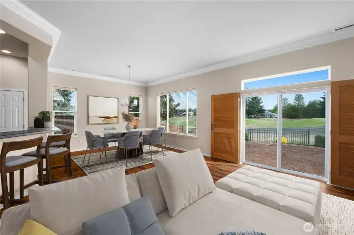 On a private corner lot with stunning golf course views, this home offers both tranquility & luxury. The great room has engineered hardwood floors & custom built-in bookshelves, creating a bright, elegant space. The spacious kitchen features a gas range and ample counter space. The generous primary suite includes a cozy gas fireplace, custom built-ins, and an en-suite bath with a full-tile shower and large walk-in closet. Down the hall, a large bonus room, second bedroom, finished flex room, and full bathroom provide versatile living options for guests, hobbies, or a home office. Outdoors, the expansive patio invites you to relax and take in the serene surroundings, perfect for quiet mornings or evening entertaining. Jubilee residents enjoy an exceptional lifestyle with amenities that include a fitness center, pool, tennis courts, walking trails, a community beach, and over 80 clubs and social groups. With dining, shopping, medical facilities, and I-5 just minutes away, everyday living is both easy and enjoyable. (Images contain virtual staging)
