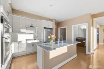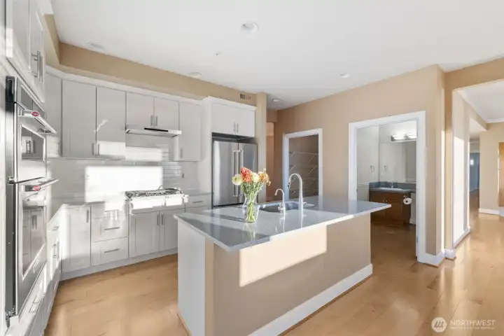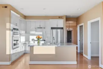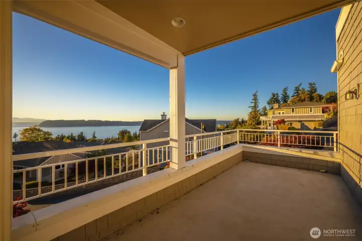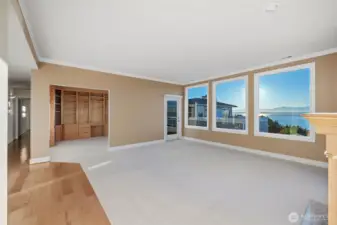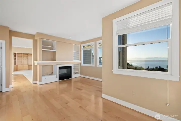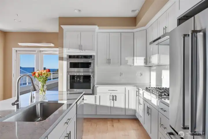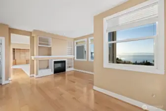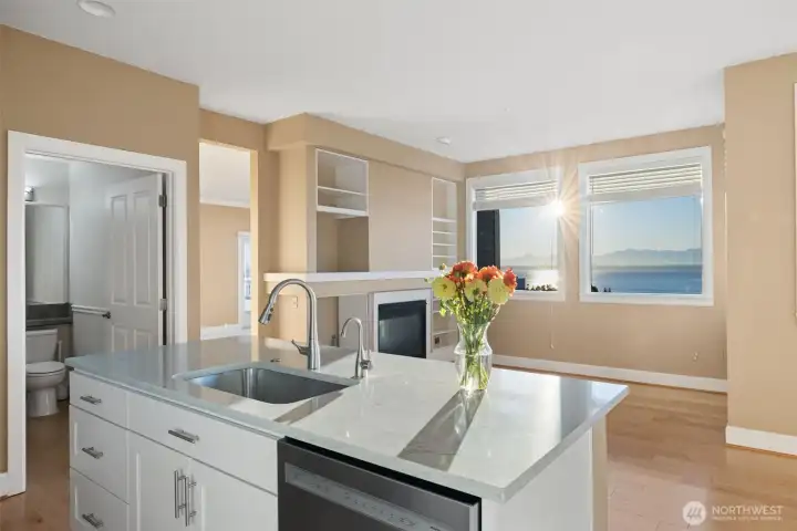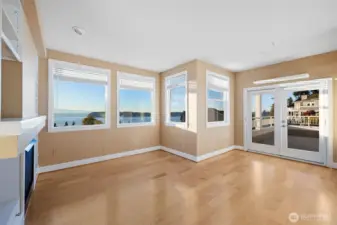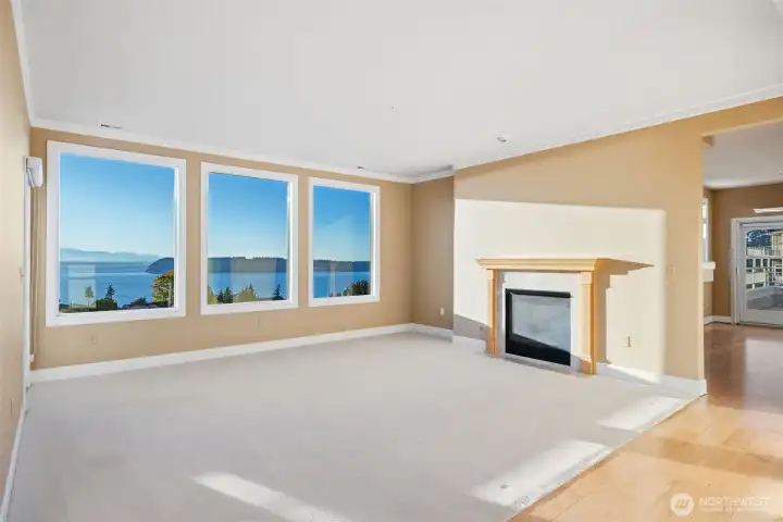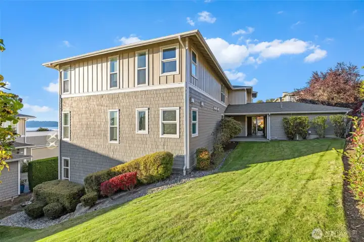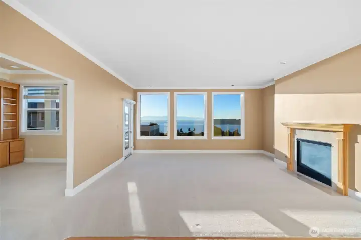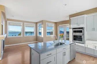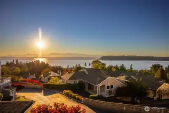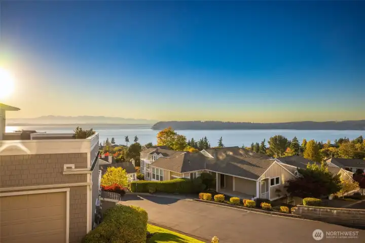 Harbour Pointe Stunner with Panoramic Views of Puget Sound, Olympics & Whidbey Island! This one-level Villa Monte townhome offers 2133 sq ft w/ 2 spacious bedrooms, 2.5 baths, a bonus room that easily converts to a 3rd bdrm & office/den. Gourmet kitchen w/ ss appl, qrtz counters, gas cooktop, dble ovens, soft close cabinets/drawers, large island & pantry. The family room & living room share a double-sided gas fireplace, primary suite has walk in closet & 5-piece bath. 2 private decks, both perfect for entertaining, or relaxing and taking in the unforgettable sunsets & maritime views. There is a 2-car garage, covered breezeway to the entry, and a side yard. Sunsets for days, whale watching, boats galore & all on one floor!