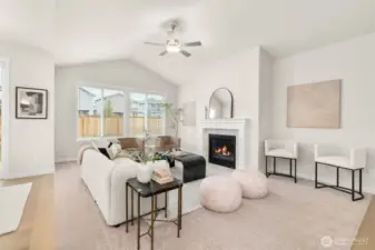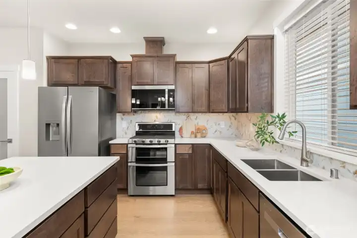 The Hemlock is a luxury rambler featuring 3 bedrooms and 2 bathrooms. The open great room flows into the kitchen, showcasing cocoa-stained maple cabinetry with soft-close drawers, full-extension guides, and an accent backsplash. Stainless steel appliances include a double gas oven, dishwasher, and microwave, plus the builder is including a refrigerator, washer/dryer, and blinds. Additional touches feature pendant lighting, hardwood floors, and clear glass French doors. The primary suite offers a 5-piece bath with tile flooring and tub surround, and quartz countertops are found throughout. The property is fully fenced, landscaped, and packed with energy-efficient features like a heat pump, solar panels, and an electric hybrid water heater. This MOVE-IN READY home is ideally located minutes from I-5 and shopping. Some photos are virtually staged.