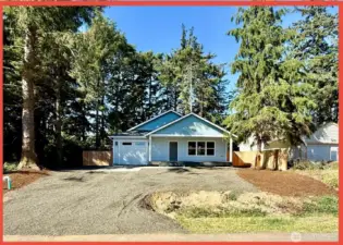 New Bungalow Amongst the Trees at Duck Lake, Ocean Shores, Washington! Perfect location across the street from the lake and near the golf course, lakefront park, or town center and beach access. Enter this 1,159sf plan by Mihalut Construction into the great room featuring a wall of windows, vaulted ceilings and fireplace. The kitchen features Quartz counters, stainless appliances and island/breakfast bar. Dining area with door to deck. Follow the hallway to the utility room, full bathroom and sunny guest bedroom with walk-in closet. Relax in the primary ensuite at the end of the hallway, complete with door to deck, walk-in closet and bathroom with dual-sink vanity and shower with glass door. Mini split heat/AC in great room and bedrooms. Fenced back yard. 1-car garage. RV parking. Full size 7373 sf lot.