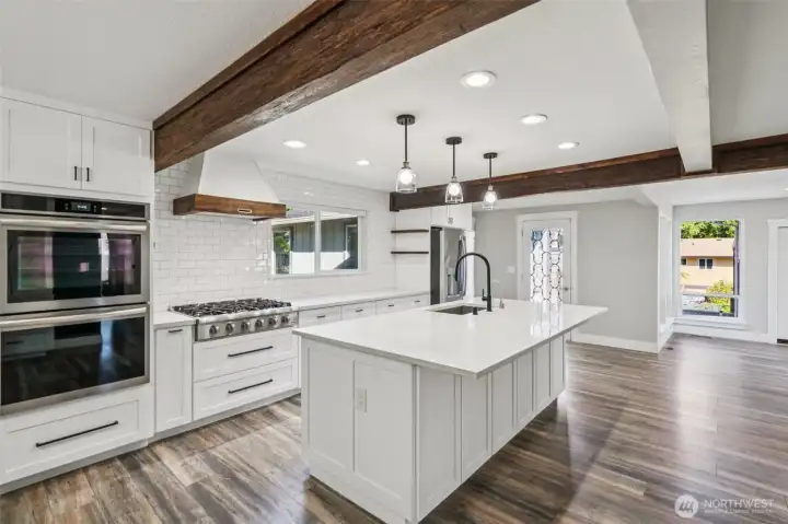 This 100-year-old farmhouse in Felida has been fully remodeled with a mid-century modern vibe, floor to ceiling windows, and an abundance of natural light. All new electrical and plumbing throughout. The open living and dining areas showcase an electric fireplace framed by a wood accent wall and built-ins. The kitchen features a built-in double oven, a gas cooktop/custom hood, and a large quartz island. A decorative door in the kitchen leads to an atrium style patio that also connects to the primary suite with a walk-in closet and luxurious ensuite bath. Two additional bedrooms, one oversized with two closets; a full bath and expansive laundry room offering exceptional storage. Unique touches include a root cellar and exposed beams in the kitchen enhancing the original farmhouse charm. Two-car garage, parking pad, carport, and extra large RV parking. Accommodates six+ vehicles. Large shed out back, space for a dog run and garden. Close to amenities and great schools.
