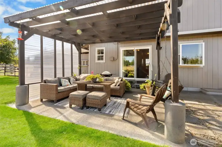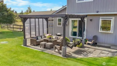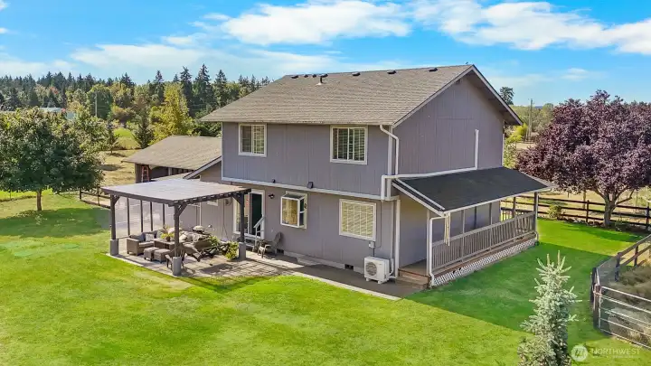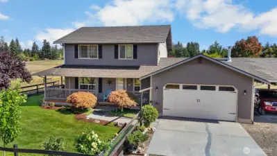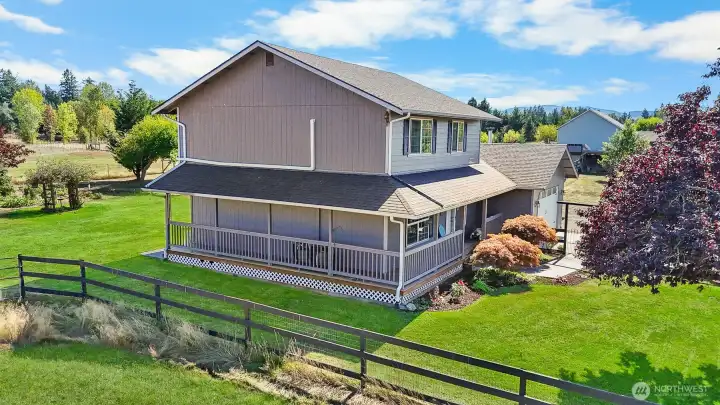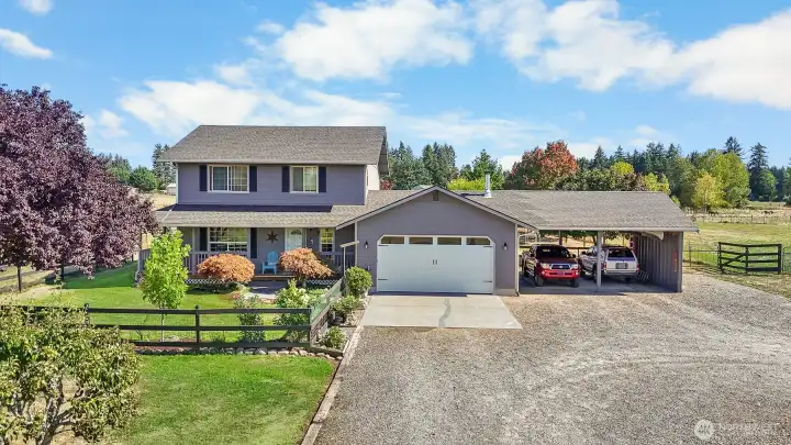 Lovely equestrian property on 5 fenced ac w/luscioius pastures. Animal shelters, open riding arena & view of Mt Rainier. Set far back from road & quiet. Meticulously maintained. Sparkling inside: gleaming laminate floors through most of home. Beautiful granite kitchen counters & breakfast bar, stainless appliances. Quality finishes: white raised panel doors, trim & crown molding. Formal dining/family room. Large laundry room/pantry. Fruit trees. Garden. Sustainable products in garden & orchard. Chicken coop. Attached garage & 2 carports. RV parking. Wiring for hot tub. Shared well w/hand pump. Covered wrap around deck & covered gazebo - perfect for relaxing @ end of day. Newer roof. Electric gate. No HOA. Close to amenities, Olympia & JBLM.
