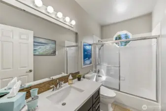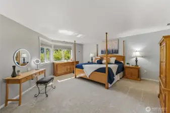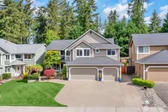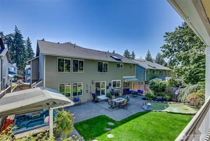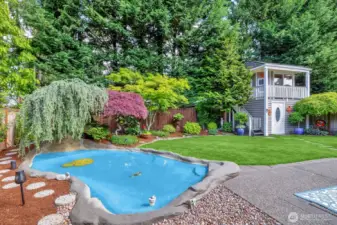 A little bit better than new; new kitchen, roof, a/c, floors, carpet/paint. 1-owner home perfectly aged. 2 story entry, wide wood stairs, lower floorplan easily blends room to room. Open living/dining takes in view of stunning landscape. Kitchen, big eat in area & huge grtrm (updated), access fenced yard. 1st flr bdrm (den) w/adj .75 bath. Upstairs:4bds/big 2nd bath. Giant Loft. Views to below. Generous primary & bath (htd flrs) updated & zen infused. The yard might become your happy place - w/big pond/wading pool, hottub,lotza hardscapes, awning covered entertainmnt area. 2-story detached STUDIO w/heat, elec, water. Could be office, shop, party/play house or? Big 3 car gar. Driveway for lotza vehicles; curb appeal 2.0!