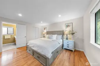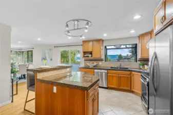 Stunning Lake Sammamish & Mountain Views! Spacious, updated home in a quiet cul-de-sac. Main floor offers 3 bedrooms, 2 remodeled baths, and a modern kitchen with granite counters, stainless appliances, eating bar, and large island. Expansive Trex deck with breathtaking views. Brand-new driveway and fresh interior paint. Lower level includes 2 additional bedrooms, a remodeled bath, bonus room , and a large family room with custom built-ins, fireplace, and new flooring. Oversized utility room with great storage or hobby space. 2024 updates include new roof and solar panels. EV charger in garage. Move-in ready with flexible living areas—perfect for entertaining, relaxing, or working from home, all with stunning lake and mountain views.