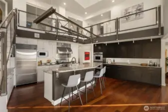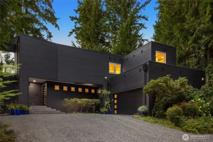 Arrow Point Modern ~ Featured in The Seattle Times, this John Brenneis-designed, Andy Mueller-built masterpiece pairs modern architecture with a stunning waterfront setting. Masterfully designed for both style & function, the airy open floor plan centers around a dramatic 2-story kitchen crowned by a pyramidal skylight & features a flexible bedroom setup. Extensive windows frame sunny NW exposure with commanding water views of the Olympics throughout the home. Multiple decks, a backyard oasis, and 90' of bulkheaded mid-high bank waterfront with beach stairs & mooring buoy define coastal living here. Quiet street, tree-lined drive & partial ownership of the 4.72 acre forest across the road. Minutes to Battle Point Park & The Grand Forest.