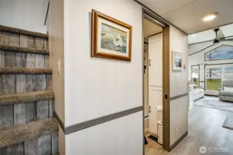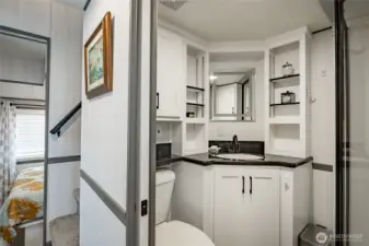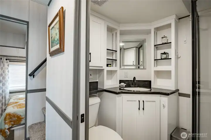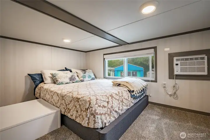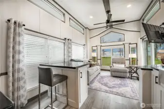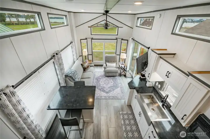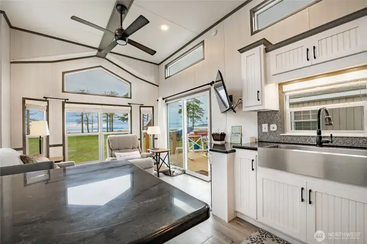 Birch Bay Waterfront Location! This turn-key home has everything! 2021 model with a light bright interior, kitchen island with room for dining, oversized farm sink and tons of storage. Living room takes advantage of the panoramic views with vaulted ceilings with surround windows, a fireplace and mounted Tv for the cozy nights. Bathroom has a step in shower for easy use, main bed has enough room on each side for access and the loft area can provide 2 extra sleeping options or flex space. Enjoy the full length deck with proper skirting around the unit and enough space for a compact car to park on the back end. Hands down the newest & best location in the park. Imagine unobstructed views year round from this little oasis!
