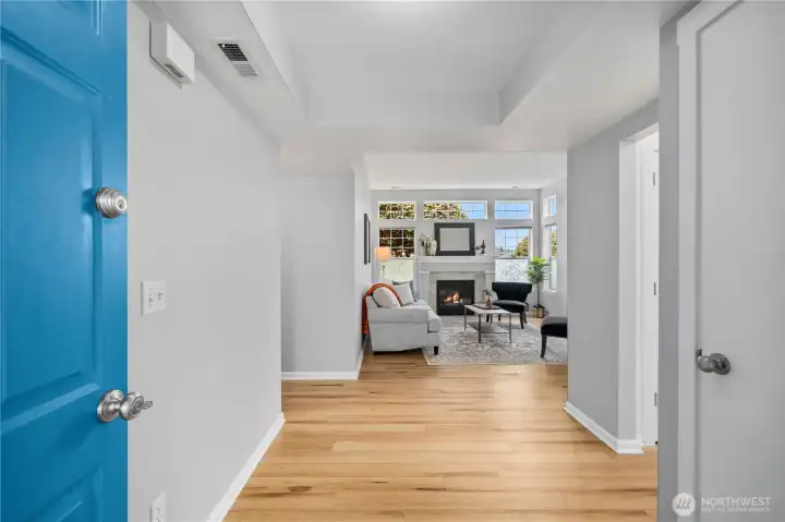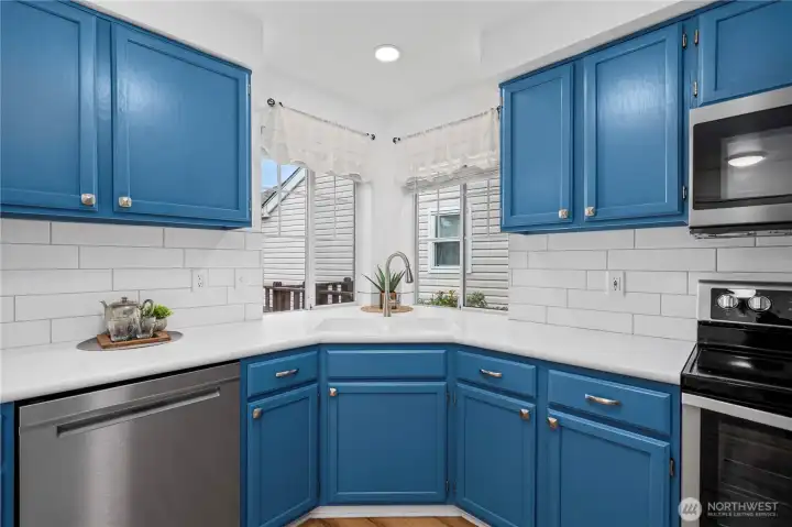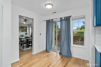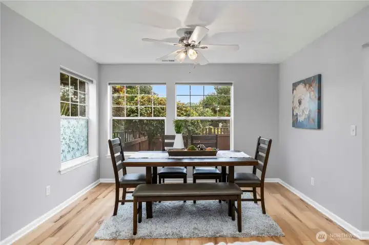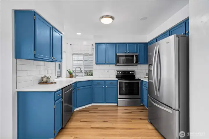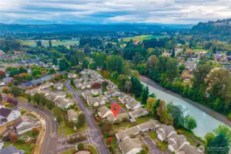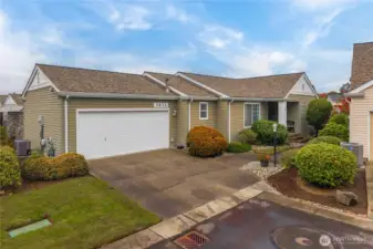 Lovely and bright Riverwalk! Detached rambler/condo, nice open airy floorplan with high ceilings. Newer easy care luxury plank vinyl thruout living area. Formal dining + kitchen nook. Nicely updated eat-in kitchen has smooth cook top stove/oven, microwave, Corian counters, stylish subway tile backsplash, newer light fixtures. Large primary suite w/walk in closet. Luxurious tiled ensuite bath and huge shower. Handy utility room w/cabinets. Fenced and landscaped backyard great for pets and outdoor entertaining. Sprinkler system, Central A/C. This community has walking trails along the Puyallup river. Easy commute to freeways.