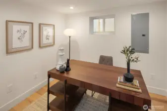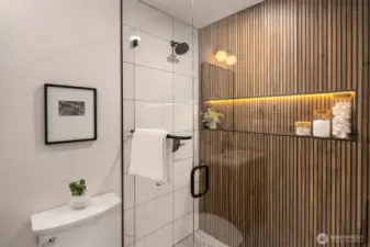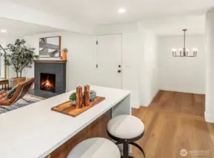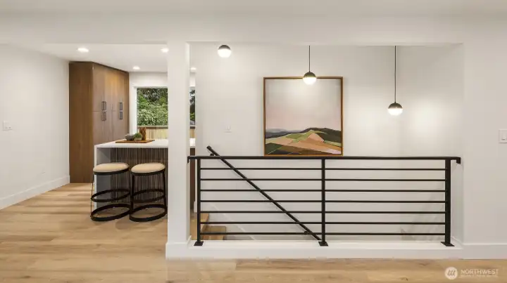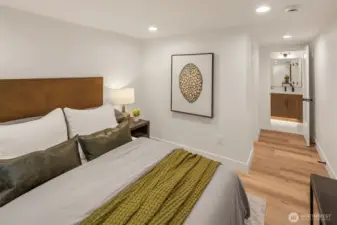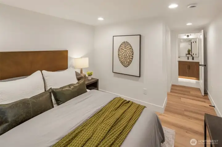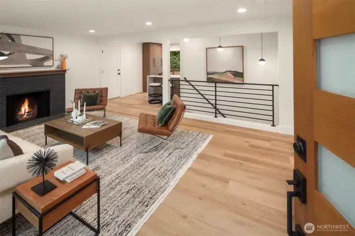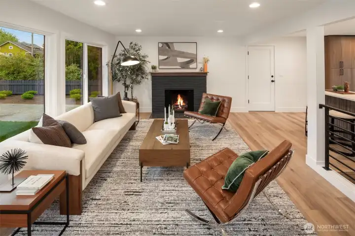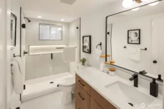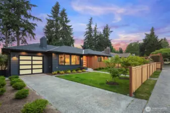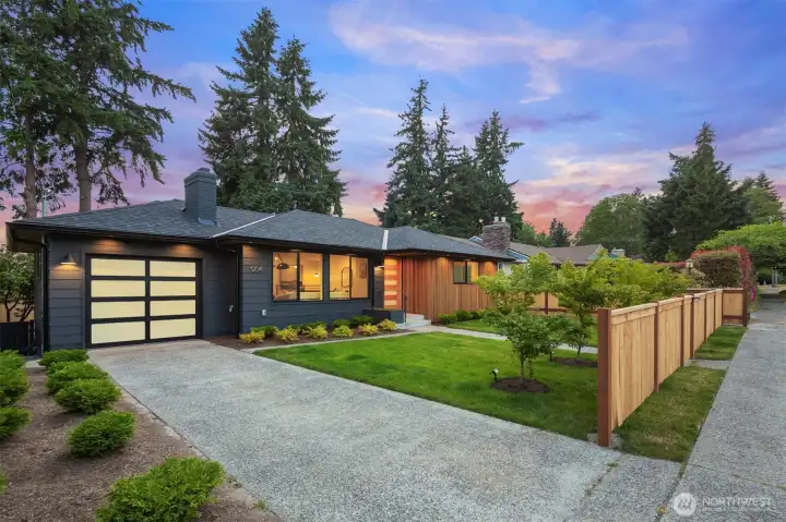 Impeccably designed & expertly crafted, this fully renovated midcentury blends timeless charm with luxury touches. Large windows flood the living room with light. Open kitchen features large pantry, under-cabinet lighting, stainless steel appliances, wood cabinets & quartz counters. Dining room opens to back patio. Main floor includes 2 bedrooms, including primary w/ en-suite bath, and guest bath. Downstairs, an additional primary w/ walk-in closet makes an ideal guest suite or multi-generational living. Expansive media/bonus room w/ acoustic media wall and built-in shelving, convenient home office, & laundry room with ample storage and stainless-steel sink. Convenient location near transit, I-5,restaurants and shops, all on a quiet street!