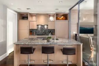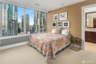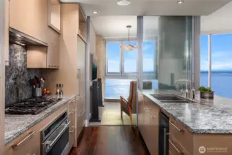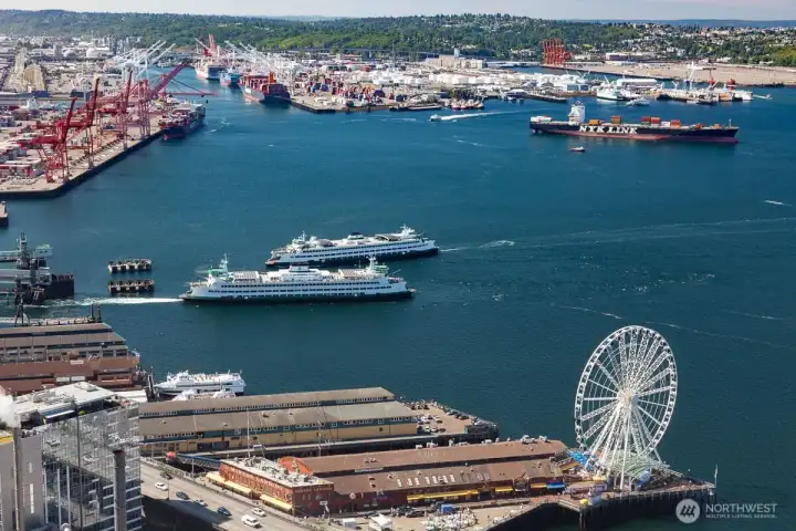 Spectacular sunsets from this 28th floor NW corner home. Views directly into Pike Place Market, Elliot Bay, Olympic Mountains, Seattle's new waterfront park and aquarium. Ferries, tugboats and seagulls. Epicurean kitchen with Wolf, Miele and Subzero. Separate pantry with extra storage. Glass room with bifold windows, large primary bedroom with ensuite spa bathroom, large toto jetted tub and shower. 2 parking spaces with EV charge ready & large storage. Coveted separate wine cellar on 2nd floor. Just steps from new Waterfront Park, Pike Place Market, Benaroya, stadiums, the arts, retail and Sculpture Park. Concierge 24/7, Two blocks to light rail, trolly and monorail. Rooftop terraces, gardens, BBQ, gym, yoga studio, boardroom, sky lounge.