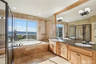 Elegant custom home! Formal living rm, gas FP w/stone surround, window wall view of Columbia River. Formal dining rm, chair rail, crown molding, access to kitchen. GR FR, gas FP, built-ins. Gourmet island/eat bar kitchen, granite, lots of cabinetry, pantry. Primary en-suite w/balcony, Columbia River views, WI closet, dual-sink granite vanity, jet tub, shower, heated travertine floors. Main-level bdrm/ofc w/built-ins, 3 addtl upper-level bdrms, 1 possible bonus/media rm. Baths designed w/pedestal sink, dual vanities, 1 w/heated tile floor. Laundry&mud rms w/built-ins. Brazilian hardwood, heated travertine, carpet. Porch, patio, gas hookups, landscaped, sprinklers. 3-car garage. Mortgage savings may be available for buyers of this listing.
