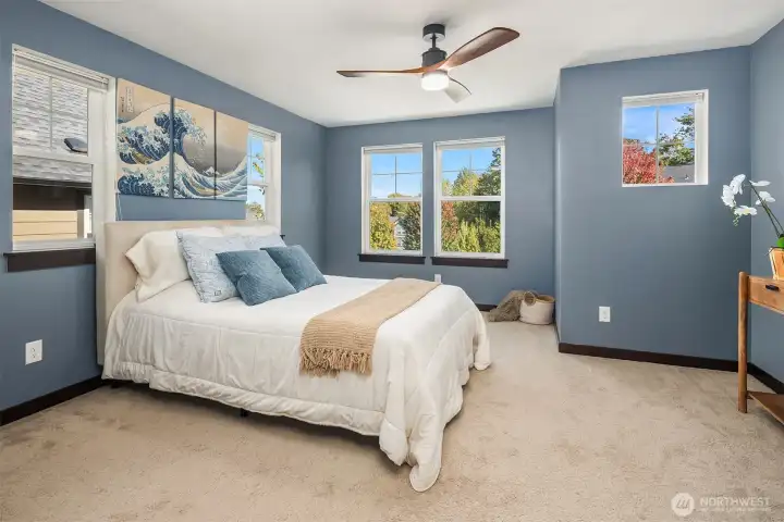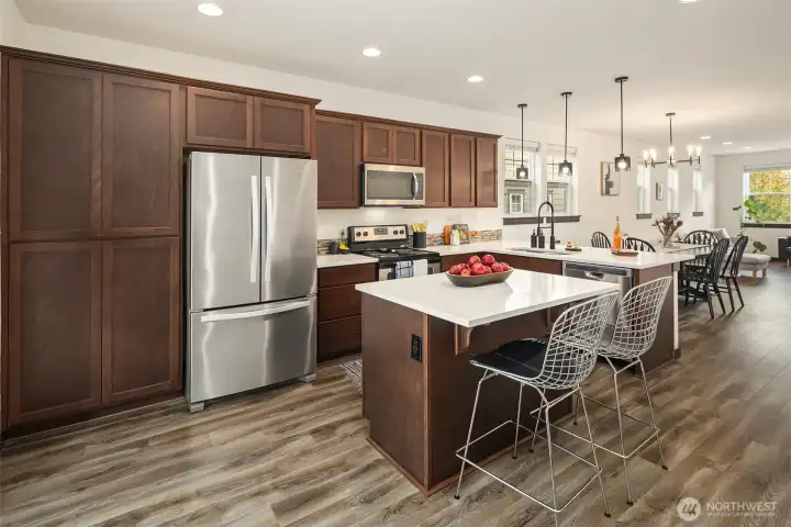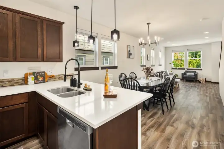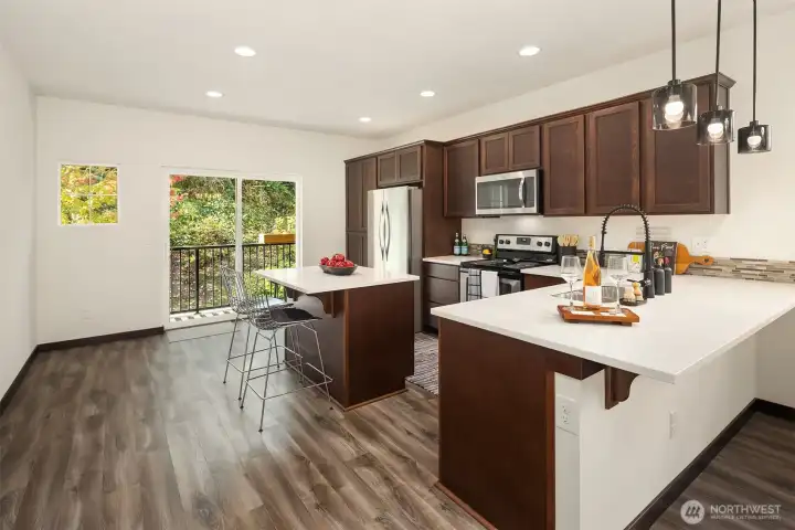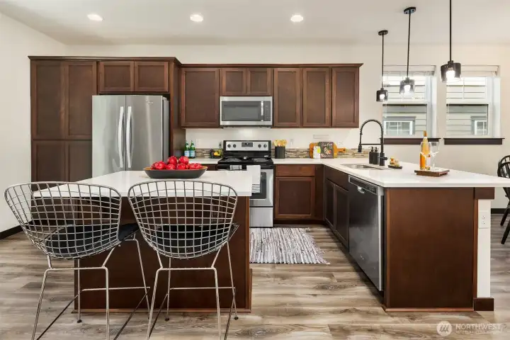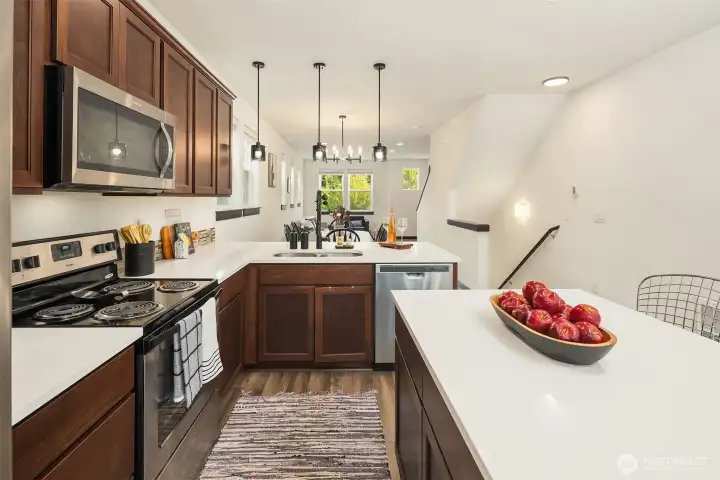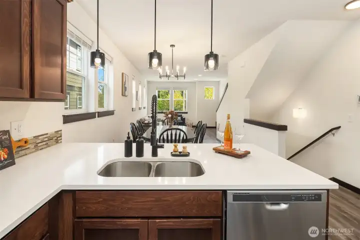 Welcome to Sylvan Ridge, a hidden gem in the heart of West Seattle where community charm meets modern convenience. This storybook end-unit townhome offers an open main floor that showcases a spacious kitchen with island, stainless steel appliances, and ample countertop space, flowing seamlessly to the dining room and outdoor deck. Upstairs, find the primary suite with ¾ bath plus a second bedroom or office with its own full bathroom. The lower level includes a large two-car garage with storage and additional driveway parking. Refreshed interior, modern conveniences, and thoughtful layout make this home a must see! Conveniently located minutes from the Junctions, Lincoln Park, Alki Beach, shopping, dining, and a quick commute into Seattle!