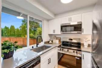 Welcome home to this beautifully updated Edmonds townhouse-style unit featuring 2 bedrooms, 1 bath, and a private garage with plenty of parking just steps from your door. Inside, enjoy modern upgrades including high-end quiet laminate flooring, fresh interior paint, new windows, and a fully refreshed kitchen with shaker cabinets, quartz countertops, under mount sink, & stainless appliances. Custom tiled shower complete this lavish bathroom set up. Step outside to your own private oasis—a fully fenced backyard with a brand-new deck, perfect for relaxing, gardening, or entertaining friends. Best of all, there are no HOA dues, giving you more freedom and value. A must-see home in a convenient Edmonds location close to shopping, dining, & more!