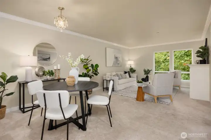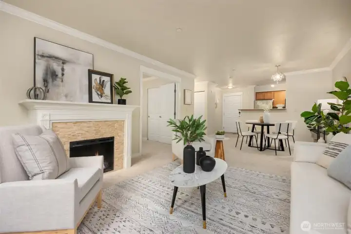 Welcome to Island Crossings, a condominium close to shopping, public transit, and island amenities such as an aquatic center and library. This one-bedroom home has been lightly lived in and well maintained. Granite countertops and stainless steel appliances adorn the kitchen and crown molding adds a touch of elegance. The living room is anchored by an electric fireplace with deep mantel. Enjoy a dedicated, covered parking space in a secure garage, and building access from lobby with code or key only. An elevator will whisk you to the third floor, where this home is located on the quiet north side of the building. Windows overlook 40+ acres of forested open space that abuts the 23-acre Sakai Park.