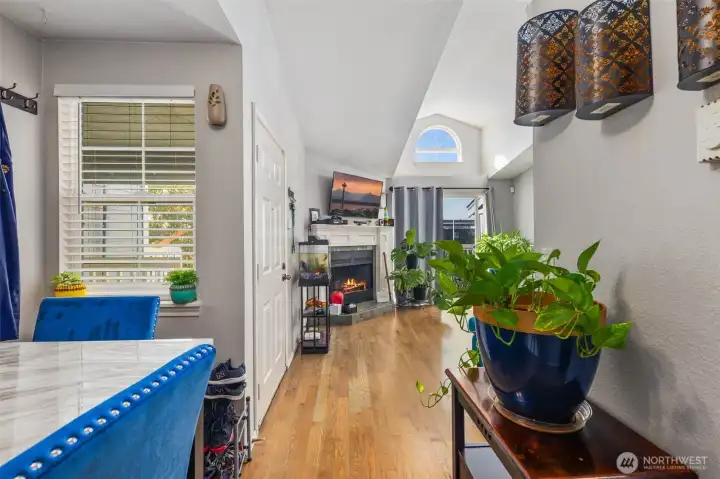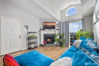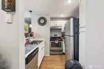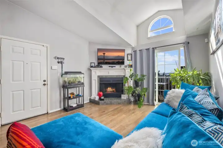Bright Top-Floor Unit with Vaulted Ceilings & View!Move-in ready 1 bed / 1 bath condo featuring stainless steel appliances, tile countertops, dual sinks, and a cozy fireplace. Enjoy a large walk-in closet, private deck with extra storage, and assigned parking plus carport. Perfect for commuters—just minutes to I-5, Hwy 99, and public transit. Great for buyers, downsizers, or investors!