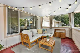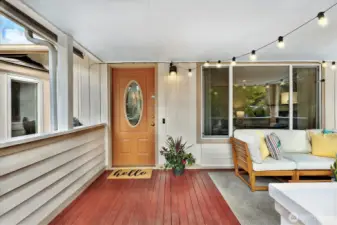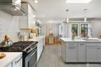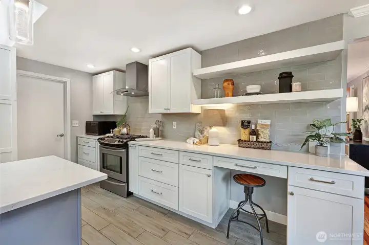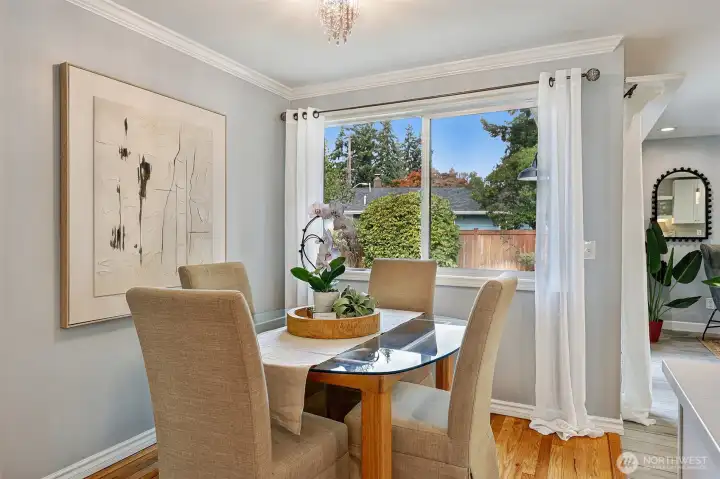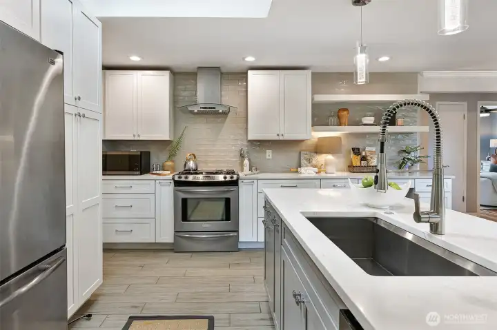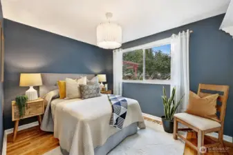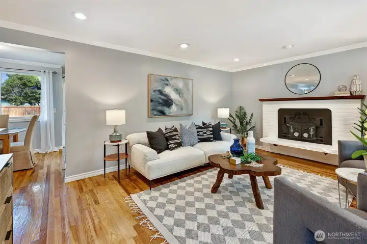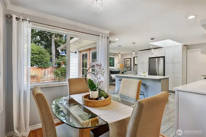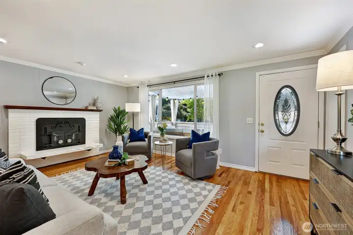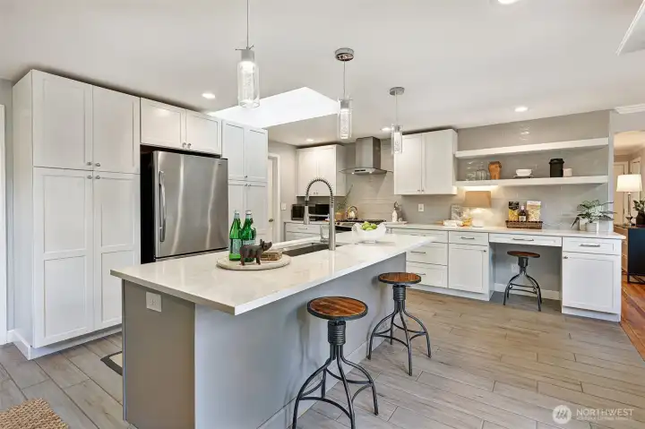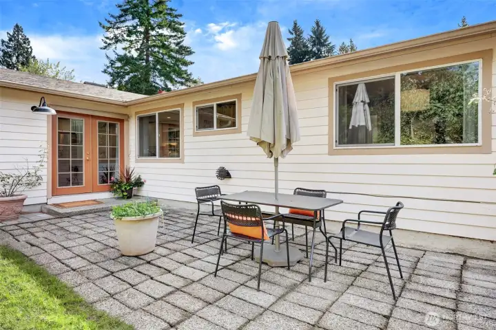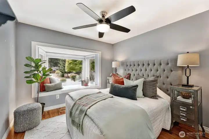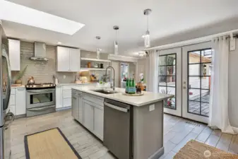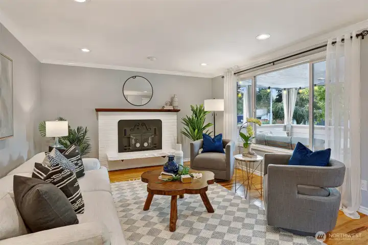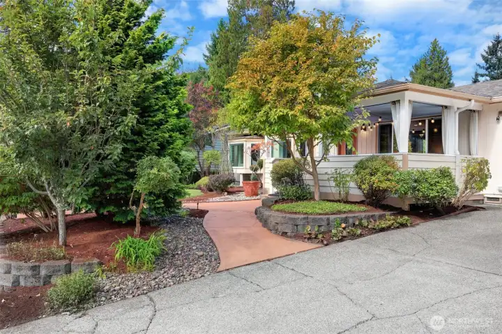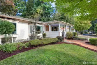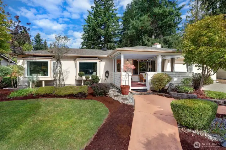 This sun-drenched Kirkland rambler has it all! Stunning kitchen made for those who love to cook & entertain features quartz counters w/bar seating, pullout cabinetry, stainless appliances & tile flooring. French doors flow to private fenced backyard oasis w/patio dining, fire pit & lush gardens, while the large covered front porch is framed by mature landscaping. Inside, beautiful hardwoods, two bright bedrooms w/window seats & a flexible 3rd bedroom or office. Comfort meets convenience w/ A/C & Ring doorbell. Nestled in a quiet neighborhood in the coveted Lake Washington school district, yet minutes to Kirkland, Juanita, & 405 - ideal for commuting or simply enjoying serene indoor/outdoor living. Impeccably maintained & move-in ready.