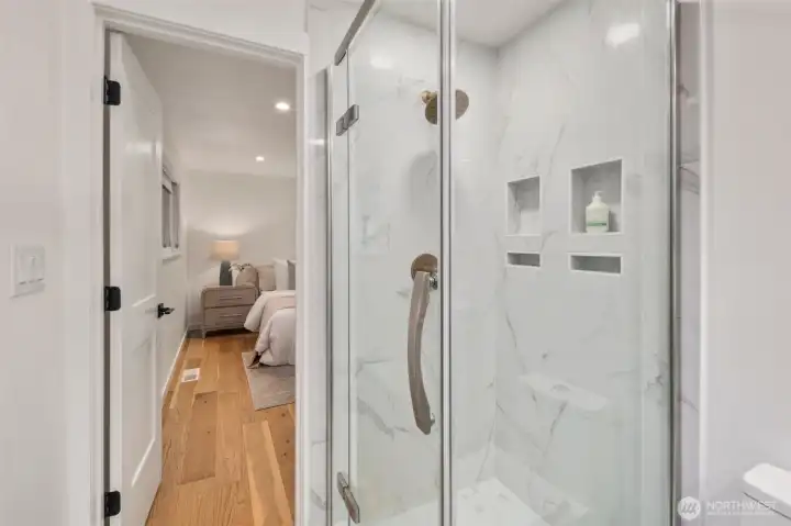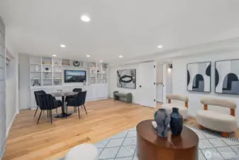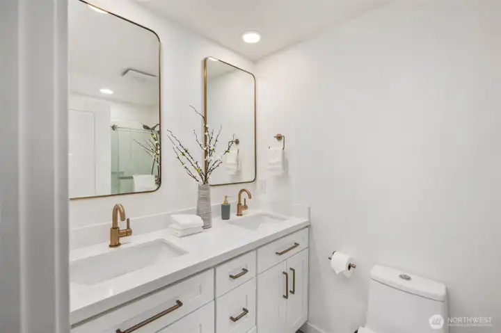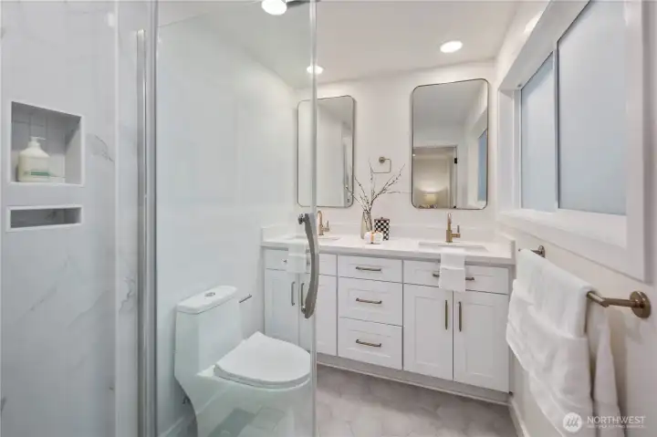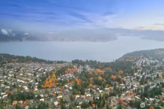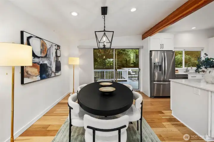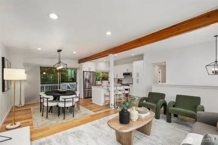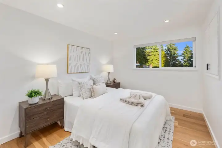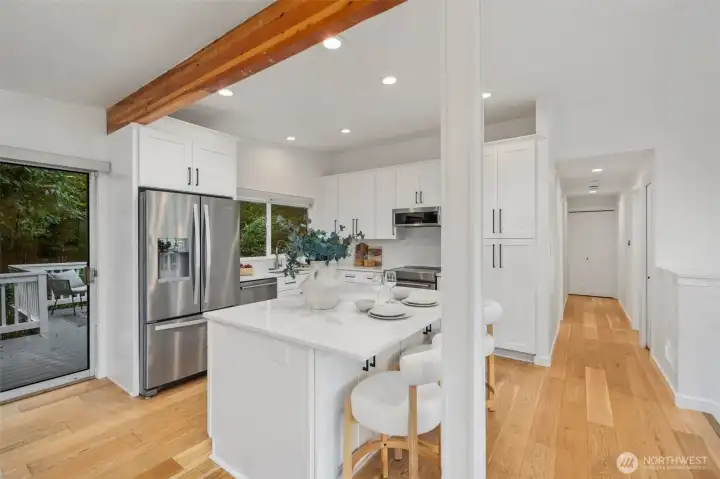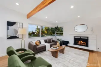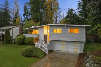 Stunning mid-century remodel in sought-after Lochmoor with sweeping Cascade views and an open, light-filled design. The heart of the home is a modern kitchen with quartz counters, stainless appliances, and an induction cooktop, seamlessly blending style and function. Recent upgrades include newer windows, A/C, furnace, PVC roof, garage doors, waterproof engineered hardwoods, plus refreshed baths, electrical, water heater, doors, and hardware. The lower level offers a spacious bonus room with a cozy fireplace. Outside, enjoy a private fenced backyard and deck. All within the top-rated Bellevue School District and close to Crossroads, parks, shops, dining, and major freeways.
