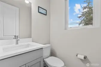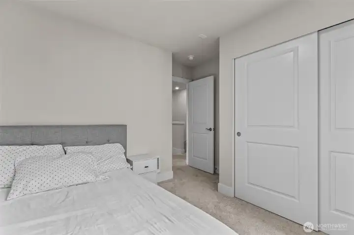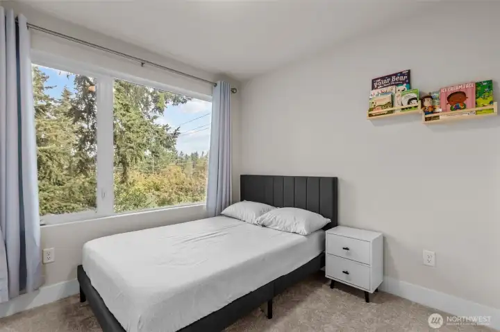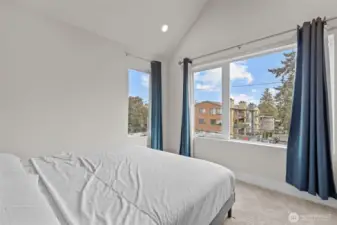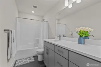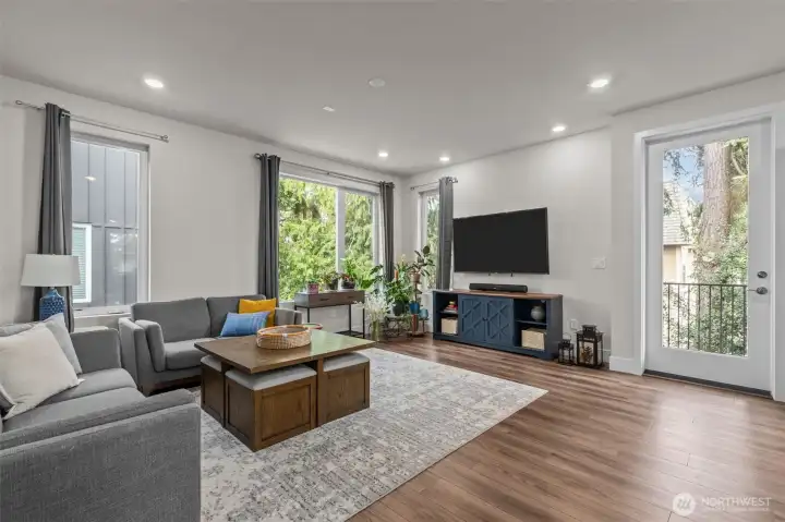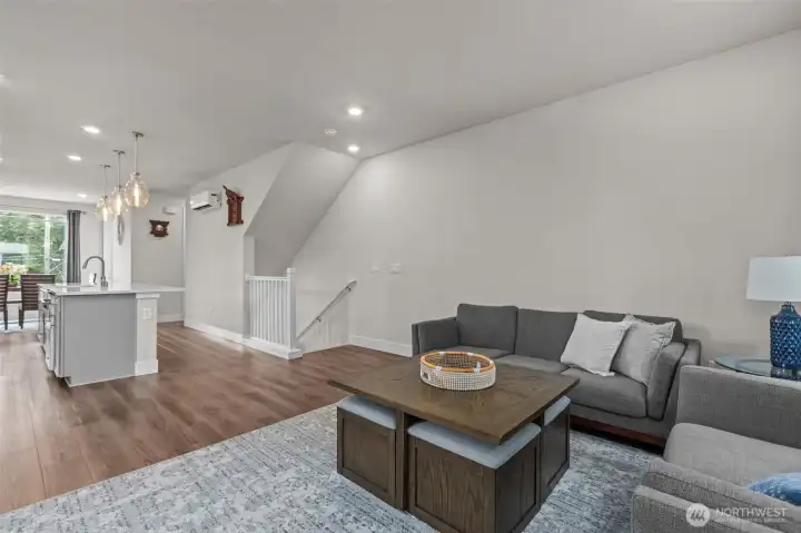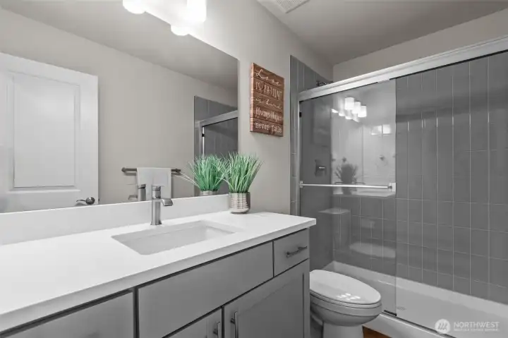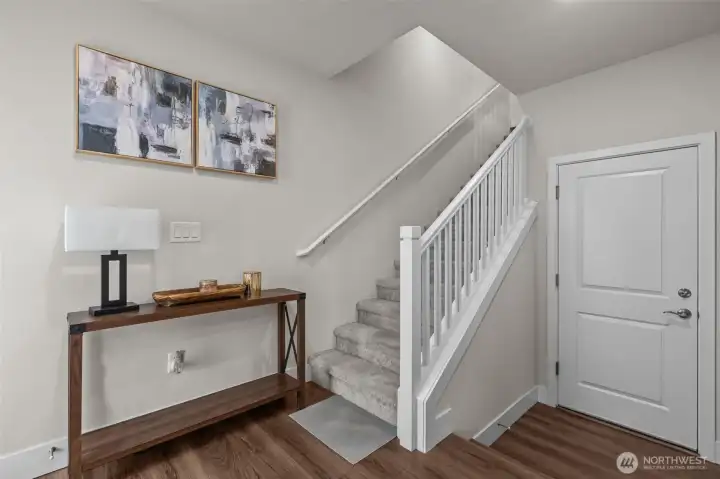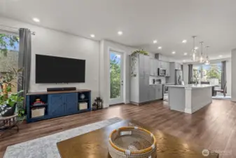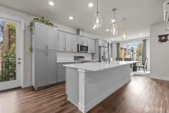 Former Model Home! 357 Degrees, by Pulte Homes, offers contemporary architecture, thoughtful interiors, and a rare 2-car private attached garage. This end-unit townhome shines with an open-concept layout, extra windows for abundant natural light. The centerpiece kitchen boasts stunning 10-ft white quartz island with farmhouse sink, gray soft-close cabinetry, chrome hardware, white modern subway tile accents & popular LVP flooring. Upstairs: a primary suite with abundant ensuite, walk in closet and vaulted ceilings. Two more bedrooms, additional full bath & utility occupy the top floor. Enjoy filtered Bitter Lake views from upper levels. Prime location with easy commuting to Seattle at your doorstep. $10K Buyer Bonus offered by Seller.