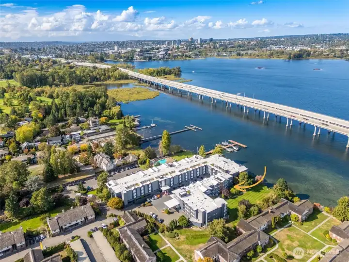 Elevated top-floor living awaits in this light-filled investment ready Lake WA residence. Walls of glass frame sunrise courtyard & water views, while soaring vaulted ceilings & fireplace create an elegant yet inviting ambiance. Designed for both comfort & convenience, the home includes in-unit laundry, new stainless appliances, two storage lockers, a premier garage spot, ample guest parking, & on-site management. Nestled on 3.3 manicured acres beautifully renewed with a $12M remodel—new siding, TPO roof, windows, decks, & more. Stroll to the vibrant cafés and restaurants of Madison Park, or unwind at home by the heated pool & private dock with moorage options. Enjoy refined resort-style living in one of Seattle’s most coveted neighborhoods. Buyer Bonus! Seller is paying 1 year of HOA dues for Buyer!