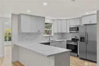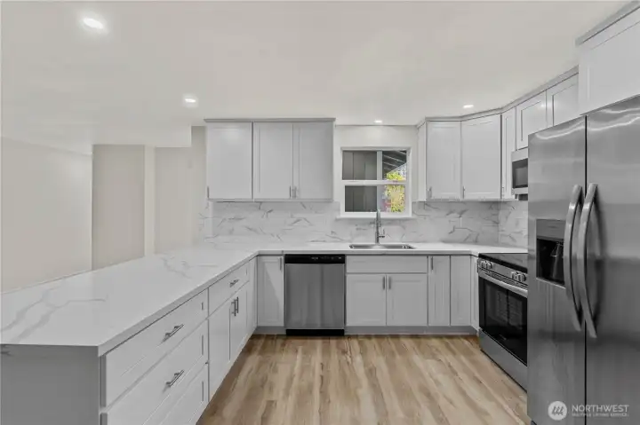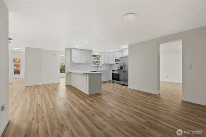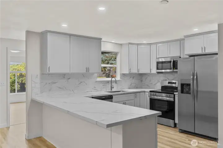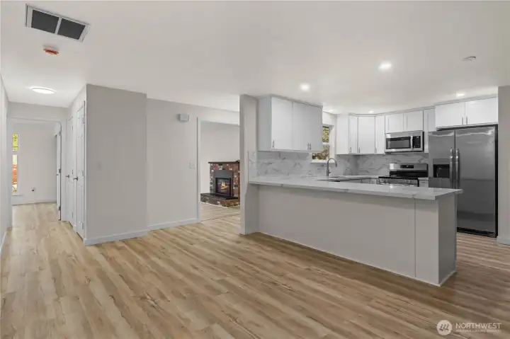 Move-in ready and fully updated, this refreshed rambler offers modern comfort throughout. The open-concept kitchen features new shaker cabinets, quartz countertops, a large peninsula, new appliances, and a tile backsplash. The home also boasts new LVP flooring, fresh interior and exterior paint, updated electrical fixtures, and new doors, trim, and baseboards. Bathrooms include stylish tile shower walls and new vanities. Attic and crawlspace insulation have been replaced to current energy codes, with a new vapor barrier in the crawlspace. This 1,563 sqft home offers 3 bedrooms, 1.75 baths, a multipurpose bonus room, and a fully fenced yard, delivering comfort and functionality.