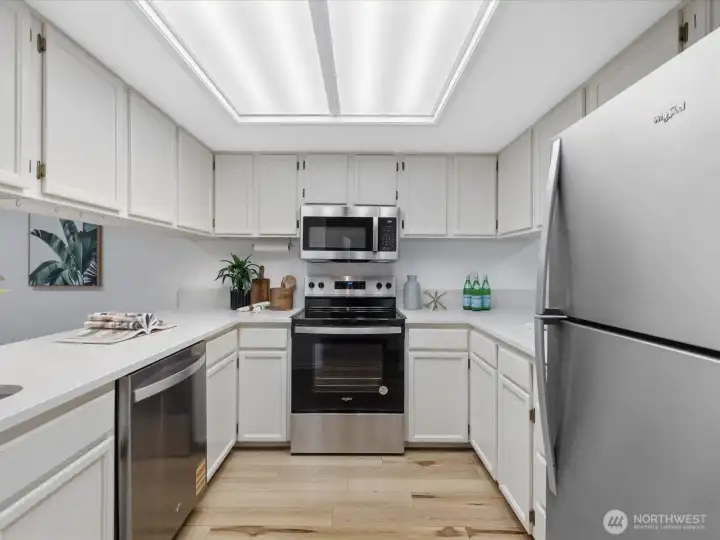 Beautiful ground floor condo, in great condition & ready to enjoy. The home features an open floor plan with inviting living room, cozy fireplace, pleasant dining room, covered patio. The kitchen is has generous work space & cabinetry, new counters & appliances & is open to the dining room & great office w/garden window. The primary suite is luxurious, w/large bedroom, doors to the patio, double closets, full bath. Beautifully updated guest bath, large second bedroom, laundry room, generous storage, private garage, second reserved parking space. You'll love the clubhouse, exercise room, pool and athletic court. The location is excellent, next to Lake Ballinger & park, convenient to freeway access & a mile from the MLT Light Rail Station.