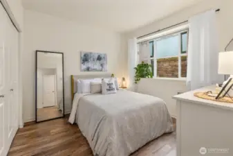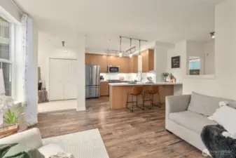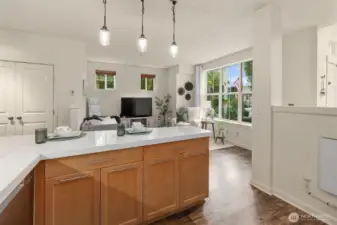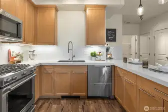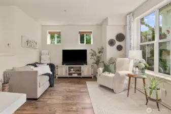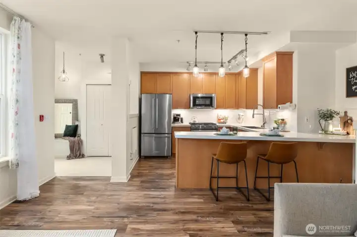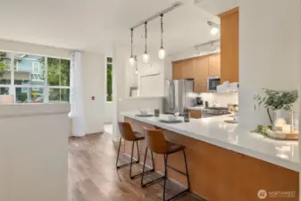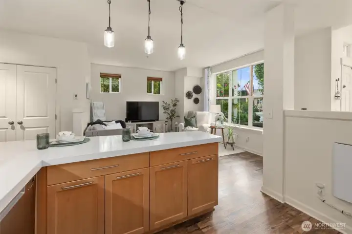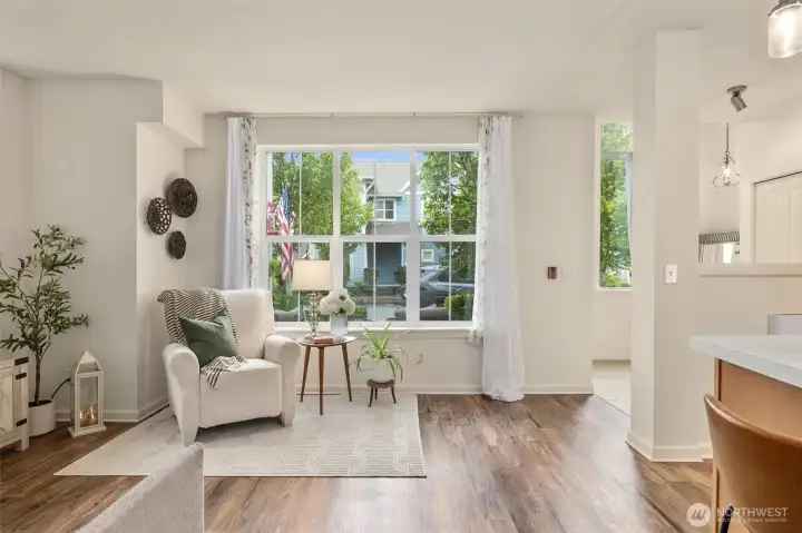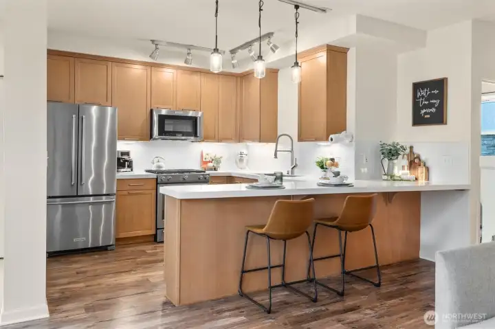 ADA-compliant condo in sought-after {ISSAQUAH HIGHLANDS} Inviting covered porch leads to a grand entry w/Tile Floors, Tall Ceilings, Sitting Bench & large Coat Closet. A natural gathering space in the cozy living rm opens directly to the updated kitchen w/custom Quartz counters, Eating Bar & Subway Tile. S/S appliances; Fridge, Gas Range/Oven, Dual-Drawer Dishwasher. New Lighting & Fresh Paint brighten the space. Laundry Closet w/new tankless H2O, while efficient radiant heating keeps the home cozy. ADA bathrm features a walk-in shower w/tiled floors & linen closet. Bedroom offers an inset window for natural light. PLUS a 1 Car Garage. Building has a NEW ROOF! Enjoy the Highlands lifestyle w/integrated trails, nearby shops, schools & parks!