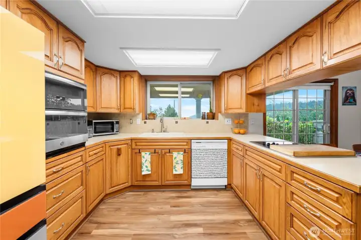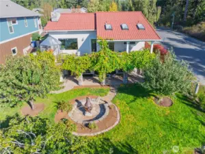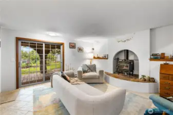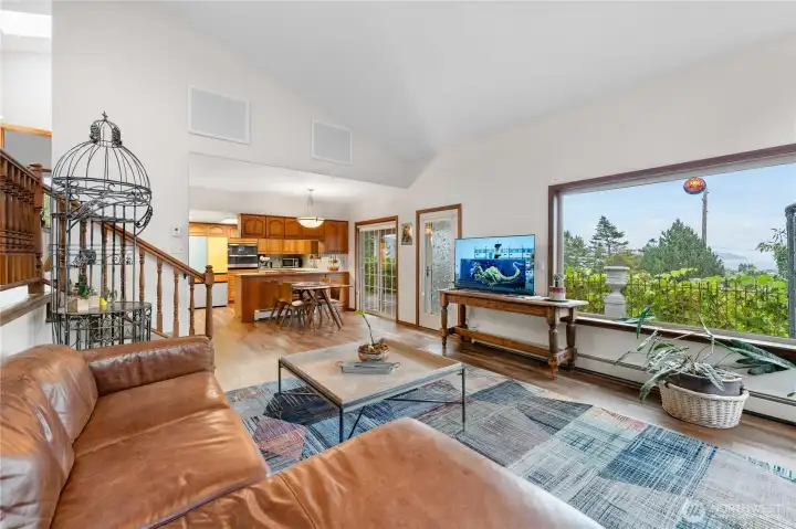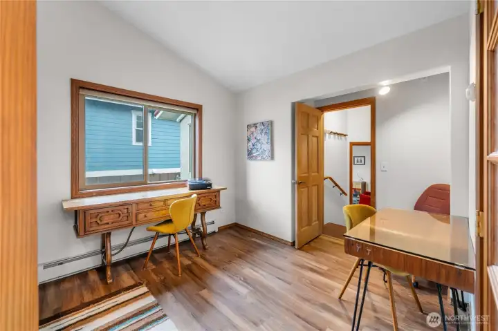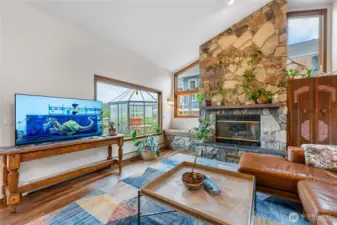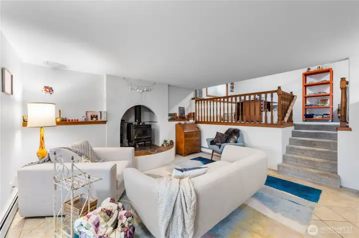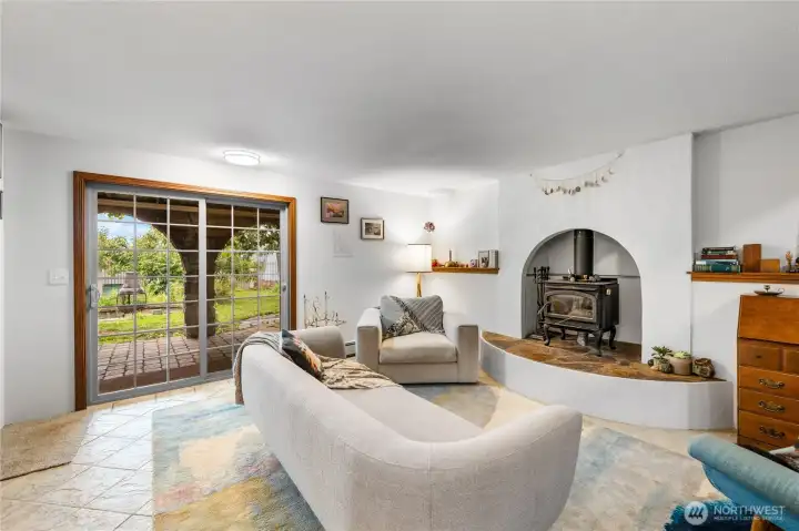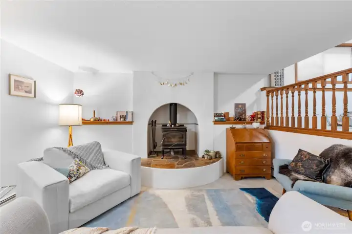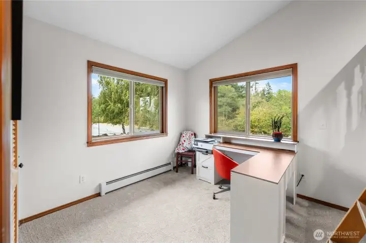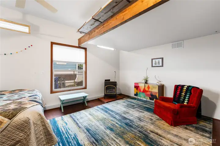 This custom, artist-designed home radiates warmth and creativity. A dramatic 2-story stone fireplace anchors the heart of the home, framed by light-filled windows and stunning water views. The main level offers a spacious suite, office, and a second bedroom with a fun loft. Downstairs adds a great room, flexible living area, and a second primary suite—add a kitchen for income potential. Radiant heating runs throughout, keeping every space cozy year-round. Enjoy the super cute yard with fruit trees, a covered patio, pond, waterfall, and fire pit. Tile roof, art studio, and all close to Washington Park!