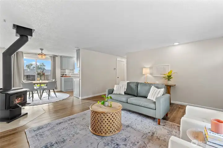 Charming 3-bedroom, 1-bath home offering 1,094 sq. ft. of comfortable living on a .19-acre lot with lovely mountain views. Thoughtful updates include a new roof (2024), newer vinyl windows, added attic insulation, and a 2020 AC unit for year-round comfort. The updated kitchen features a pantry and small utility area, while the living area boasts portrait windows and a cozy wood-burning stove. The updated bathroom includes a heated floor for extra comfort. Outdoors, enjoy mature landscaping, a fully fenced backyard with irrigation, and a well-maintained front yard with curbing. Additional highlights include ceiling fans, gutters, and an attached 2-car garage. Move-in ready and inviting! Professionally Inspected.