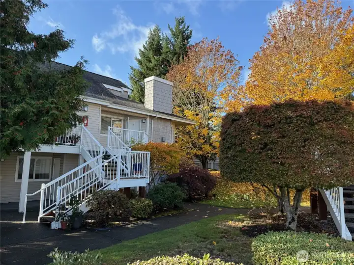 Spotless corner unit in gated, peaceful, beautifully landscaped Windsong Arbor- individual garage out front. Newer Carpets, 2” blinds & paint. Living room with gas fireplace looks out to serene wooded area; vaulted dining area opens to kitchen with newer frig, washer/dryer, new laminate flooring , loads of cabinets and counter space and wave-activated counter lighting. Large upper bedroom with full bath upstairs. HOD include maintenance, WSG AND GAS. Community center great for gatherings, or to use workout machines or relax on patio. Extra pkg @ comm center; Sport court and pet areas too. Walk to Benson on busline, where shopping and restaurants abound. Super convenient – usually under 5 min to 212th St Exit off 167