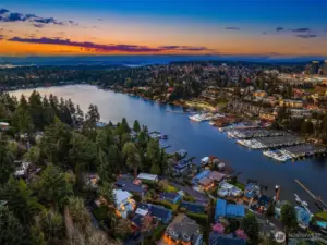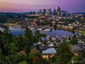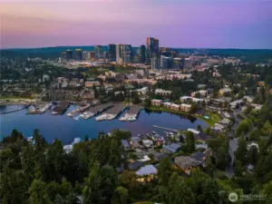 Experience breathtaking views of Lake Washington's Meydenbauer Bay, Marina, and the Bellevue skyline from this masterpiece by Overbrook Construction, located less than a half-mile from Old Main Bellevue. Thoughtfully designed, this architectural marvel blends steel, stone, concrete, glass, and wood to create stunning spaces, including a main-level guest suite, open living areas, and a chef's kitchen with a large island, custom cabinetry, and butler's pantry. The primary suite features sweeping views, a spa-inspired bath, and a bistro-view deck. The lower level offers a media room, wine cellar, and private ADU with full kitchen, and patio entry. Elegance, privacy, and modern sophistication in a prime Bellevue location.