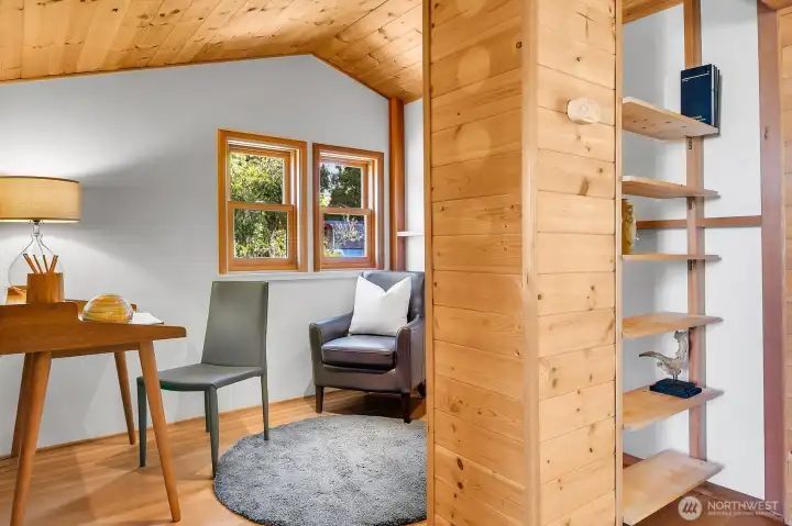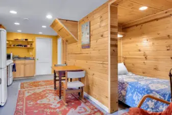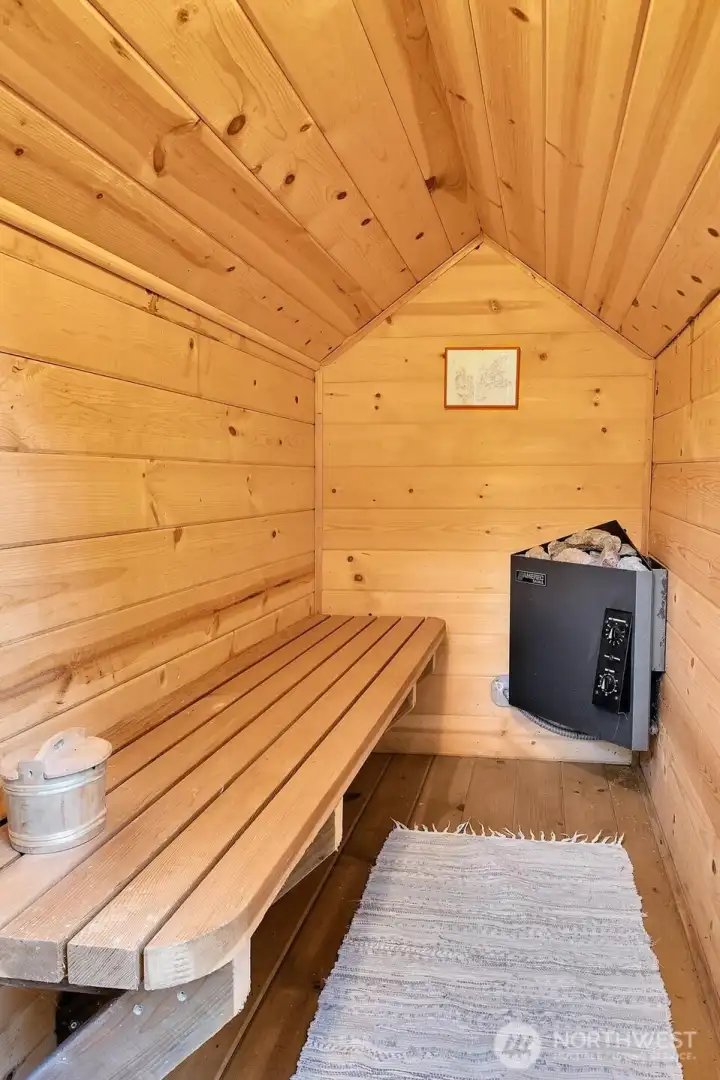 Situated in a prime location, on a quiet street, this unique Sunset Hill Home, Ballard, will make you feel at home at first sight. Main Floor has Bed/Bath, living room w/ fireplace, dining room, kitchen w/ large eating area OR family room, w/ wood burning stove. Walk out through the Solarium with vaulted ceilings & stained-glass windows to the storybook garden with a cozy deck, Sauna & Playhouse in a serene setting among majestic Birch trees. Upper level has 2 BR & extra finished room. Extra sleeping area in unique 'bed in the wall" Lower level has rec room, 3/4 bath, laundry, craft room/storage. Bonus: this level has a Studio Apt. with separate entrance, kitchen, large bath & washer/dryer. Great for MIL or rental.