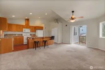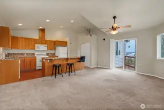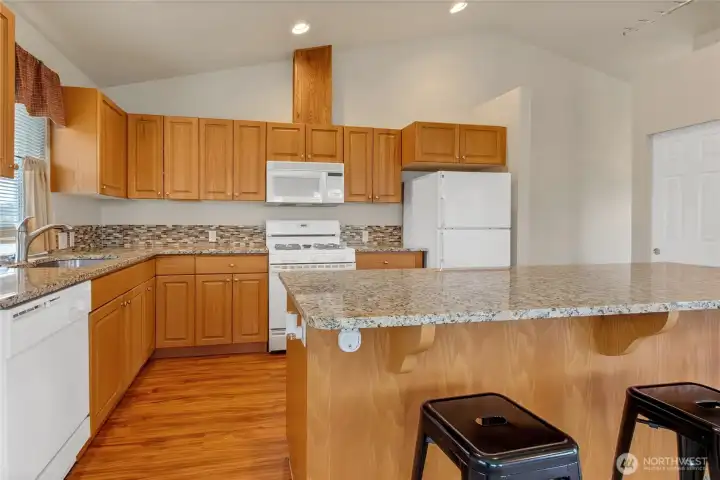 Inviting 3-story, 1 bed/1 bath condo near downtown Tacoma! Top floor features an open living area with vaulted ceilings, granite kitchen with large island and bar seating, plus a deck with Mt. Rainier and city views. Second floor offers a spacious bedroom, dual-sink bath, and oversized walk-in closet that could be used as an office or flex space. Two-car garage on street level adds convenience.