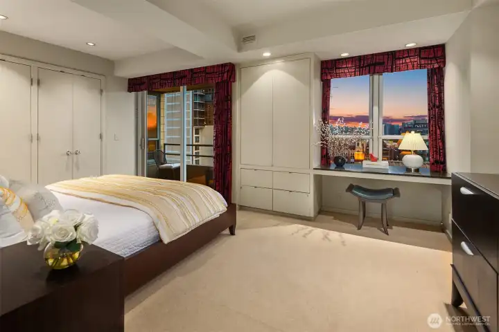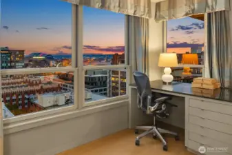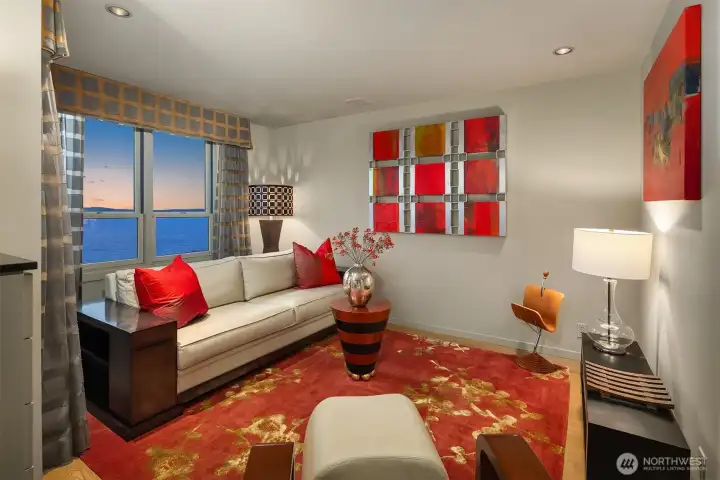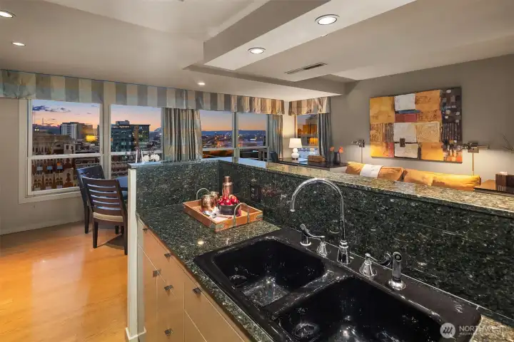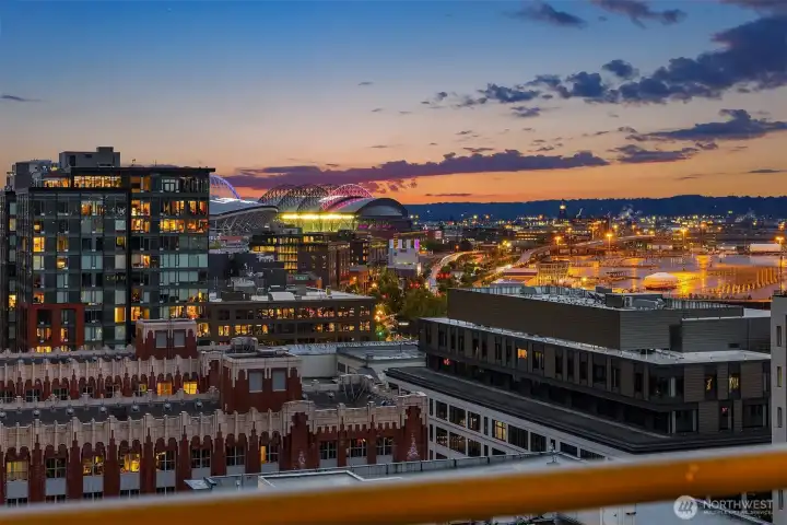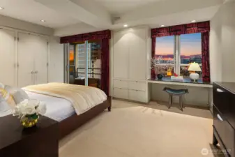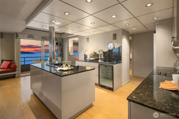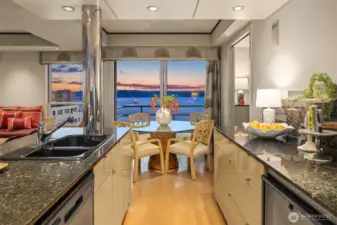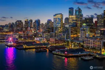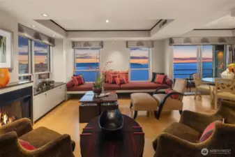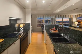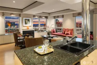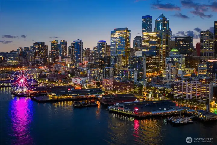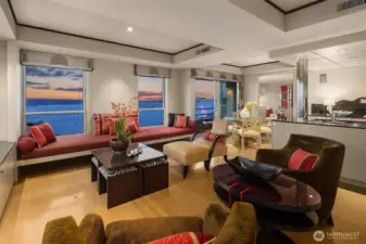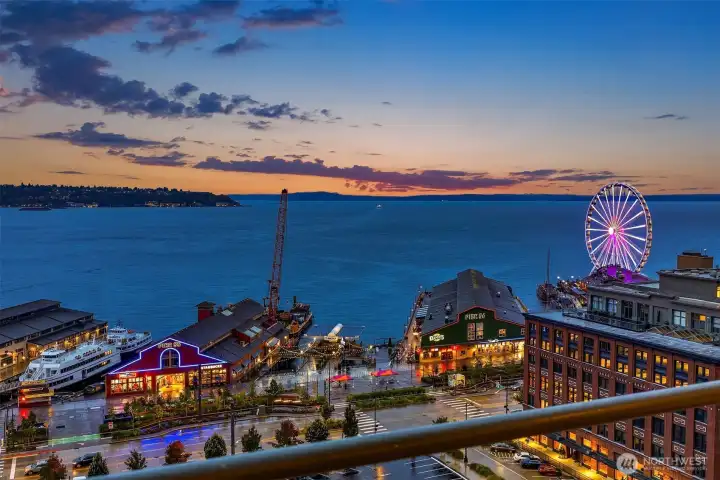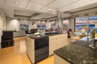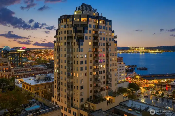 Exceptional SW-corner residence in the renowned WATERMARK TOWER with sweeping views of Mt. Rainier, Elliott Bay, the Olympics, the Great Wheel, the city skyline & the new waterfront promenade. A rare opportunity, this expansive retreat combines 2 premier units into one with 2 kitchens, 3 BR, 3.75 BA & 3 private view decks. Flexible floorplan with dual entrances offers ideal separation for multi-gen living, guests, or MIL. Refined interiors feature slab granite, SS appliances, hardwoods, custom built-ins & gallery lighting. Amenities include a reimagined Art Deco–style lobby, fitness center, sauna, rooftop deck, clubroom, storage & secure parking- all in the heart of downtown, just steps to Pike Place Market, ferries, dining & entertainment.