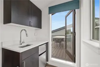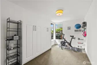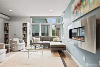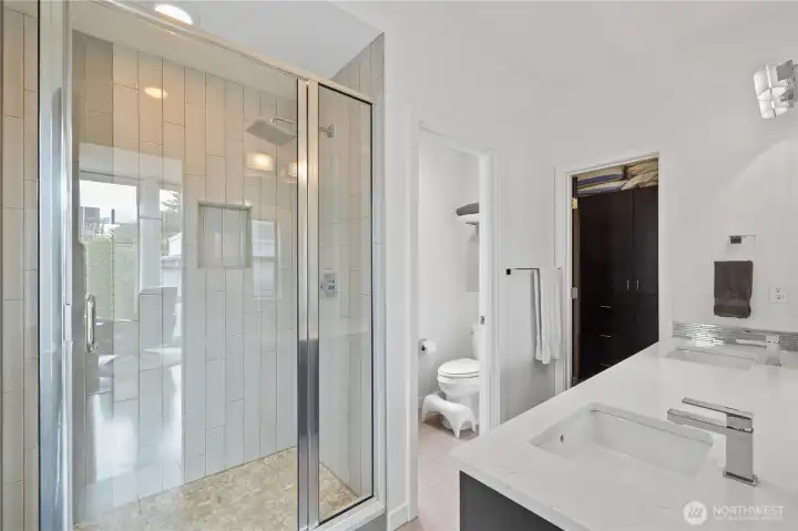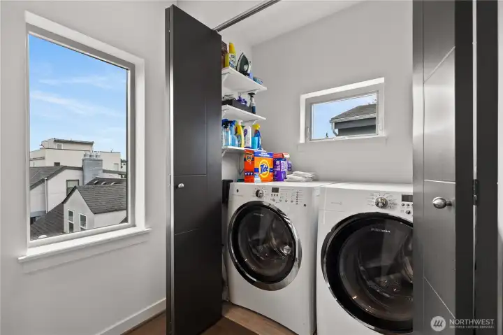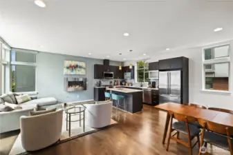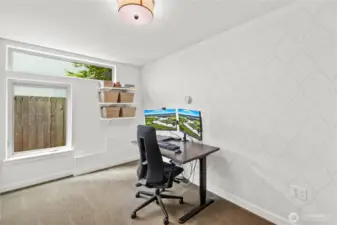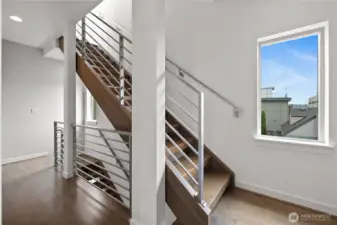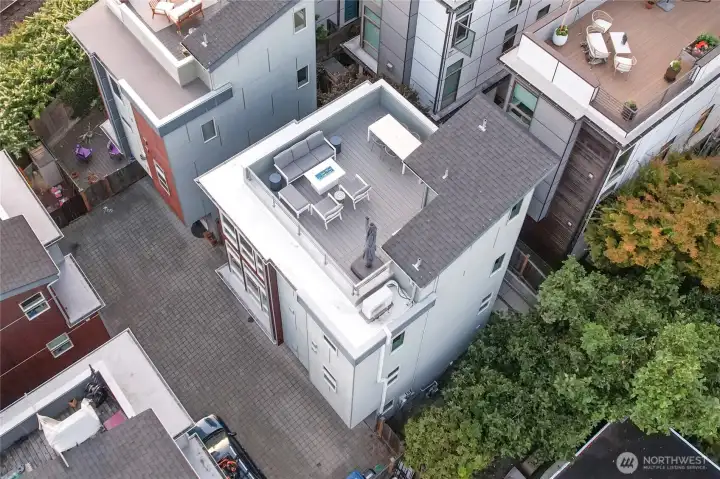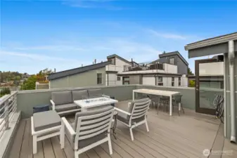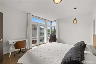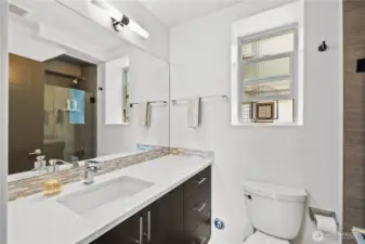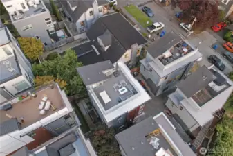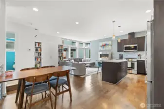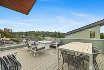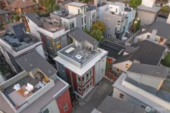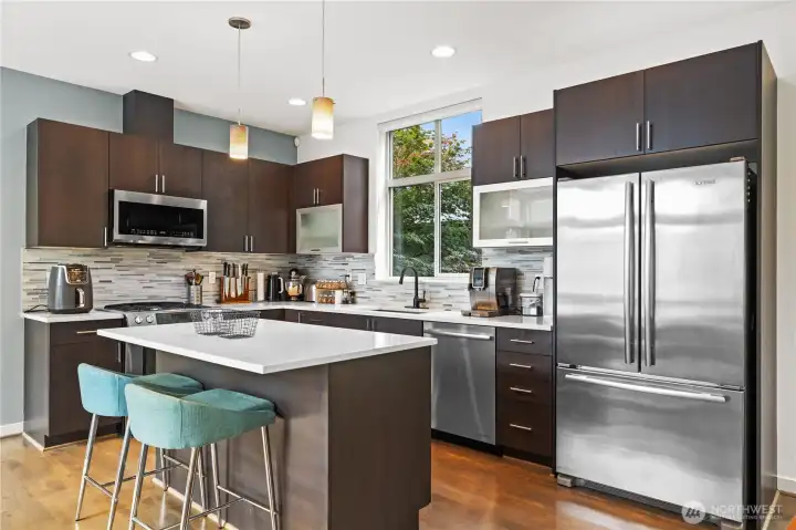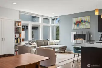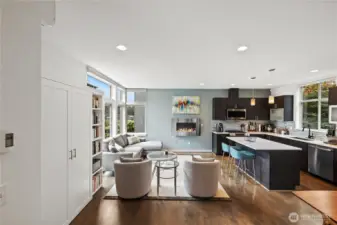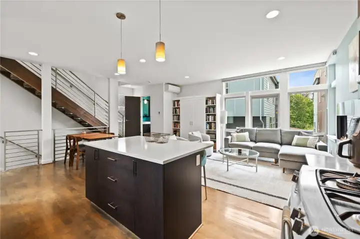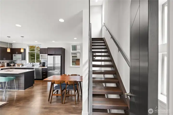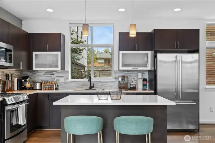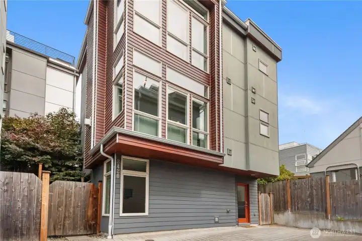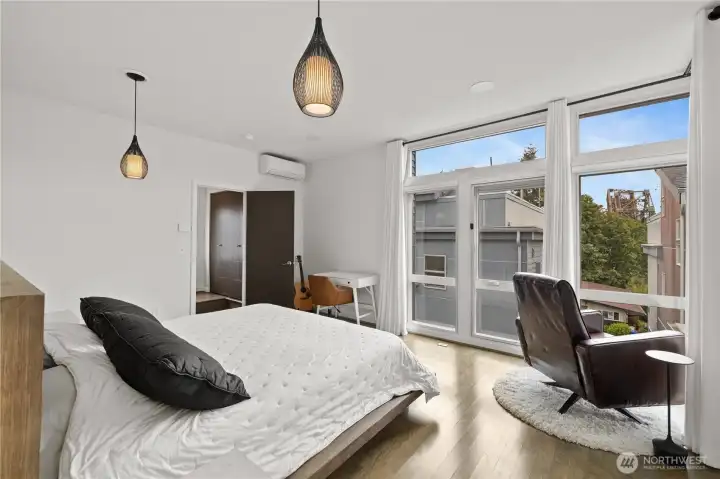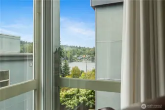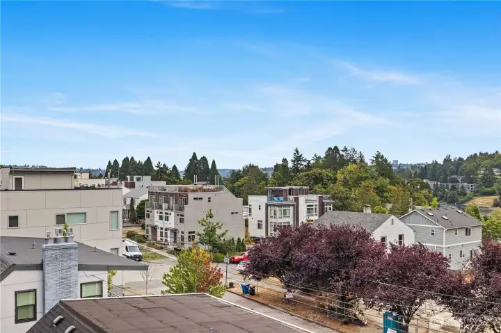 Perched above Salmon Bay in Sunset Hill, this stand-alone home offers exceptional quiet thanks to interior storm windows, while capturing sweeping views and sunsets from a low-maintenance composite deck atop a brand new roof with transferrable warranty ($114k). Floor-to-ceiling windows frame water, greenery, and Salmon Bay Bridge. Open kitchen pairs with site-finished hardwoods and floating stairs. The primary suite offers views, a walk-in closet, and spa-like bath. Custom upgrades to this 3-bed, 2.25-bath home include custom cabinetry, Murphy bed, under-stair storage, and an indoor/outdoor catio that can stay or go. A wet bar adjacent to the rooftop deck makes entertaining effortless. Dedicated parking. Walkable to all that Ballard offers.