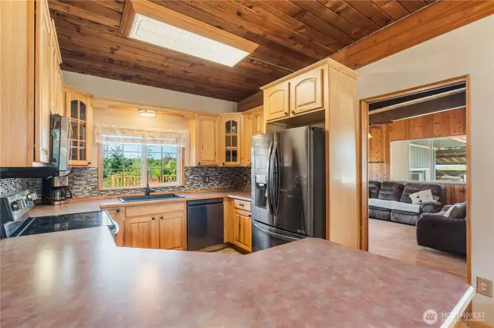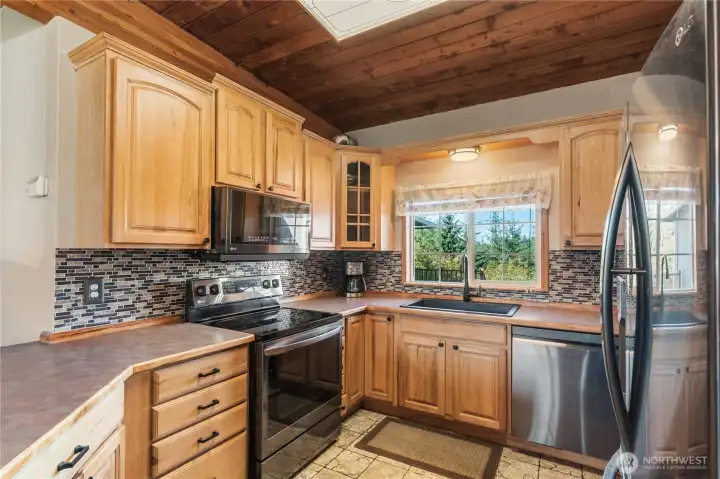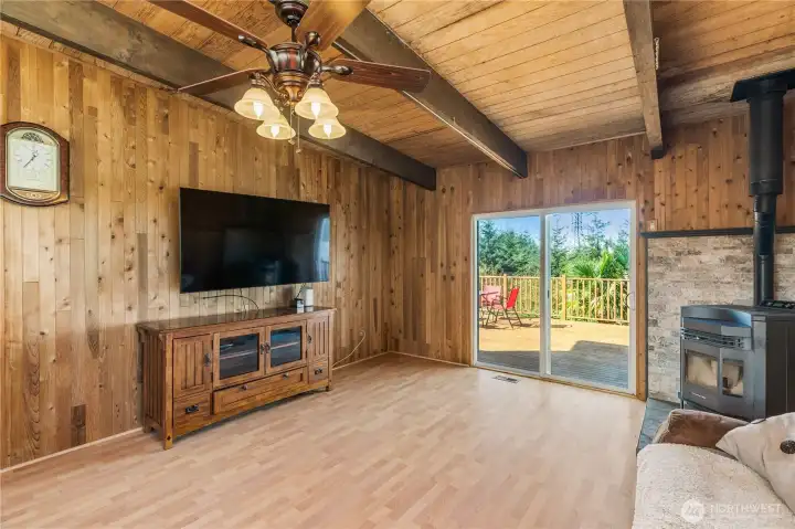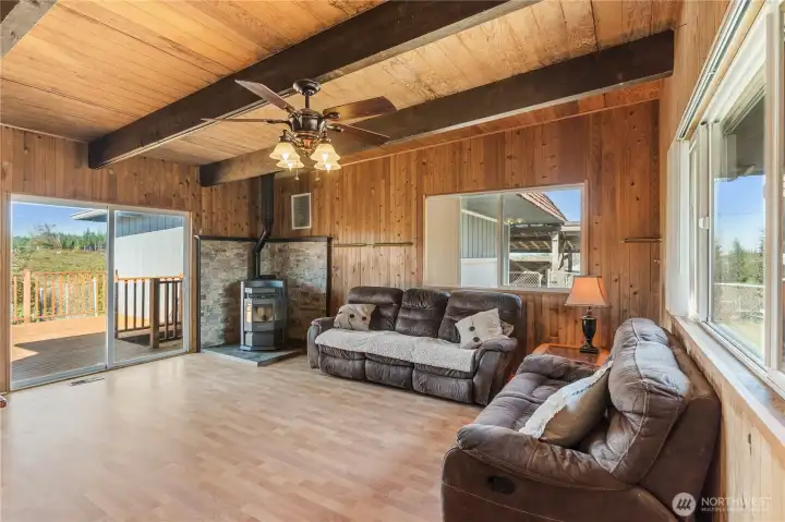 Charming 3BD/2BA rambler sits on 1 acre with mountain views! This 1,332 sq ft home features soaring ceilings with tongue-and-groove detail, a cozy pellet stove, efficient heat pump, and double pane vinyl windows. The updated kitchen with abundant cabinets and black SS appliances flows seamlessly into the dining and living rooms, making this home perfect for entertaining. The spacious primary suite boasts a fully redone full bath, with tile shower, huge garden tub, and a stylish barn-door closet. Enjoy outdoor living on the oversized deck overlooking peaceful surroundings, or sit around the patio fire-pit. A 2-car attached garage adds convenience, and a small shed is perfect for extra storage. Plenty of room to relax, garden, or play.