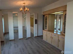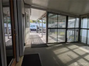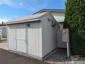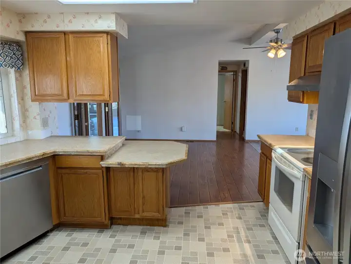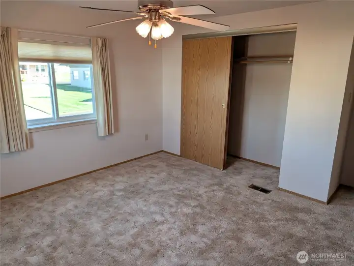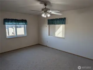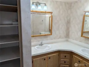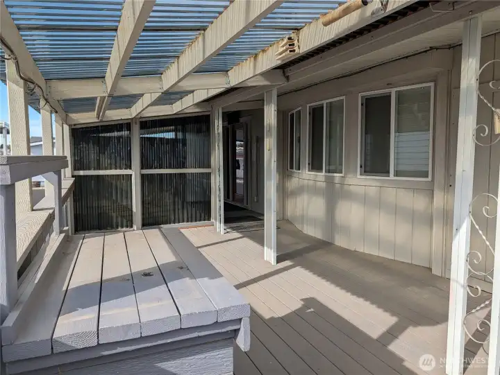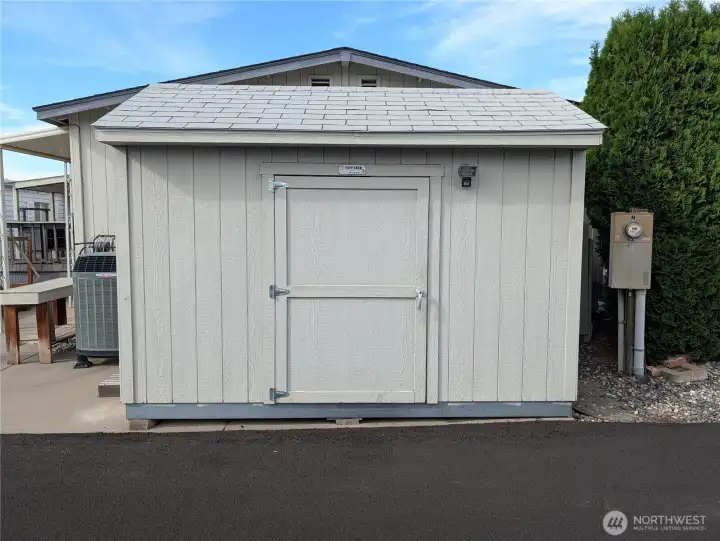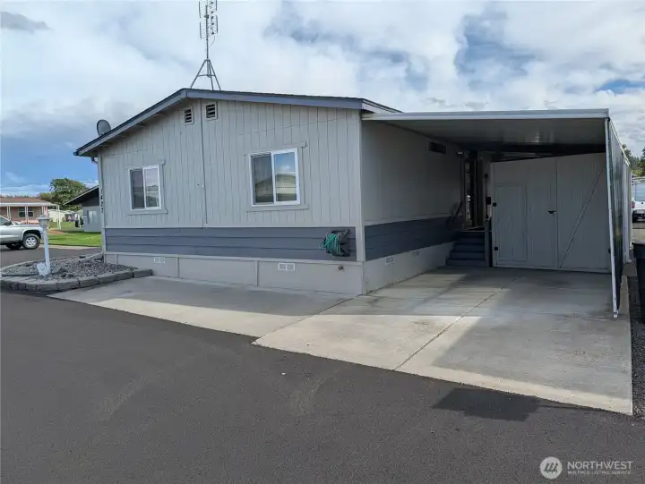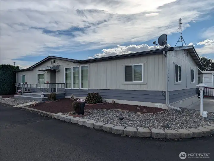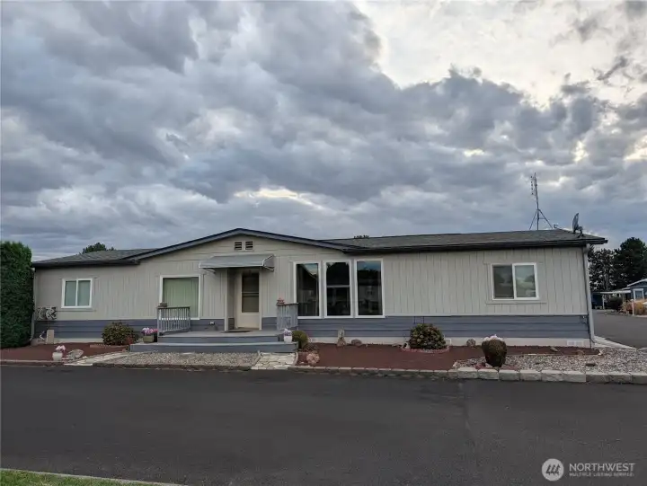 Rare opportunity for well cared for home in highly desirable Golden West Estates. Large 1624 sq. ft open floor plan w/ 2 bdrms on one end w/ full ba. & Primary bdrm & updated primary ba. w/ large tiled walk-in shower, double sinks, tiled floors & skylight at the other end. Updated High efficiency HVAC & water heater for many years of dependable use. Newer stainless steel refrigerator & dishwasher w/ skylight in kitchen that has eating bar off dining area w/ ranch style door w/ opening sidelight panels leading out to cover patio deck. Deck also has large BBQ area w/ an exit door off the utility room. Rock landscaping w/ drip irrigation to plants & pots, no grass to mow! Wired & insulated storage shed too. Located across from pool & Rec Hall.