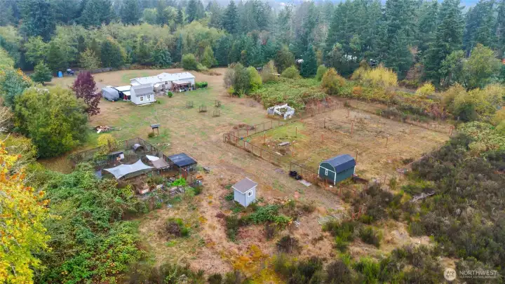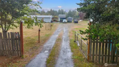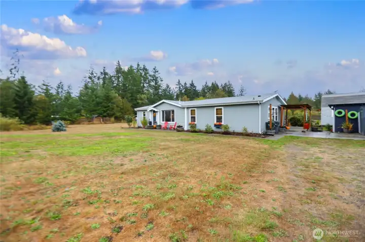 Five usable park-like acres with brand-new roof (2025) and brand-new 2+ car garage/shop! This lovingly updated home offers an open floor plan with vaulted ceilings, new flooring and paint, remodeled bathrooms, and a modern kitchen with new countertops, glass tile backsplash, and stainless steel appliances. Pellet stove and central A/C for year-round comfort. Outside you will find fresh landscaping, raised garden beds, fruit trees, many outbuildings, covered patio, fencing for animals, wired for generator, RV hookup, and 8'x'20' storage container. This move-in-ready home offers room to spread out and enjoy the country. Perfect for hobby farm, bring your animals!