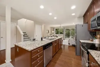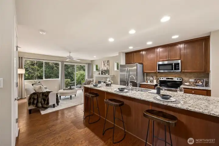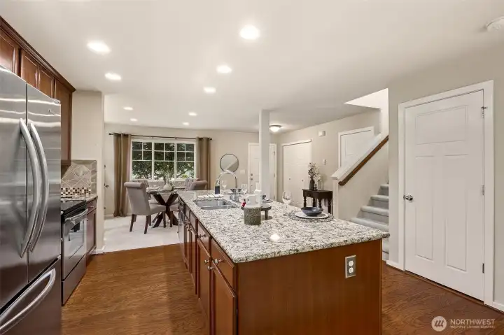 Welcome to this well cared for 2-story home in Harbor Crossing. Step inside onto laminate floors on the main level. Open kitchen concept with oversized island, stainless steel appliances, granite countertops & tile backsplash. Cozy up in the family room with gas fireplace & tile surround, with complete privacy out the back slider. 3/4 bathroom, recessed lighting & dining area/living room also featured on main level. All 3 bedrooms upstairs including the primary en-suite with dual sinks, tile countertops, walk-in closet & large step-in shower. Primary suite on backside of house overlooks low maintenance backyard backing up to greenbelt. Also on upper level is the 2 guest bedrooms along with full hall bathroom. Walking distance to shopping!