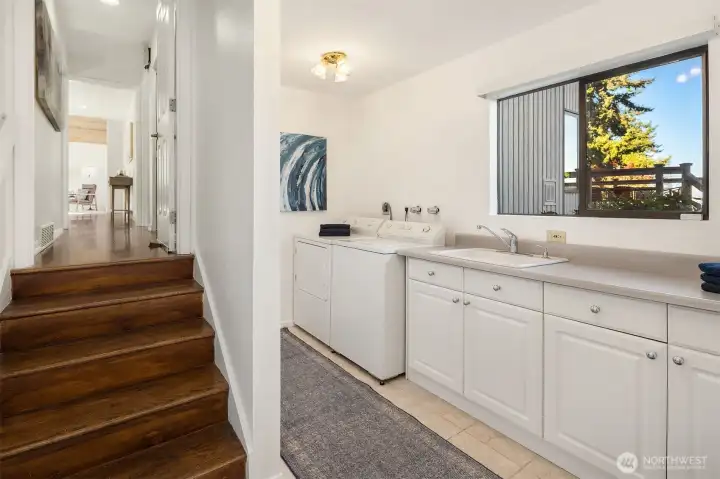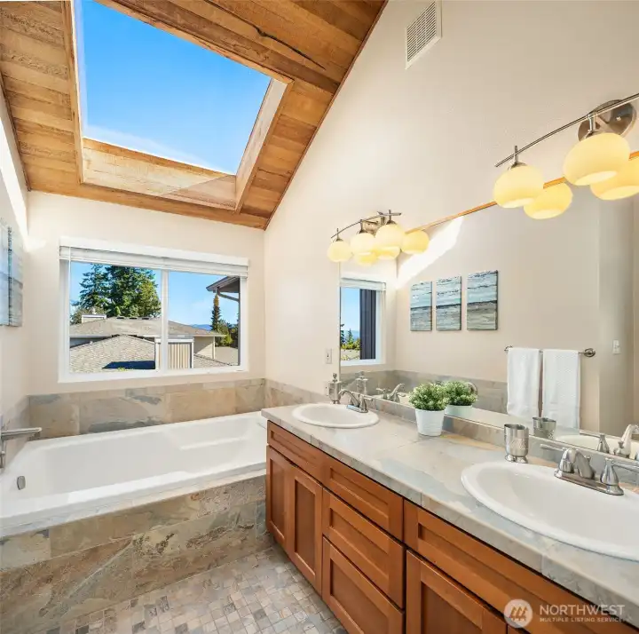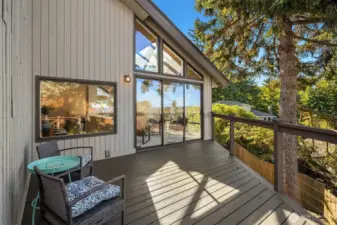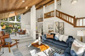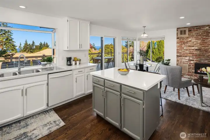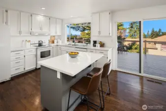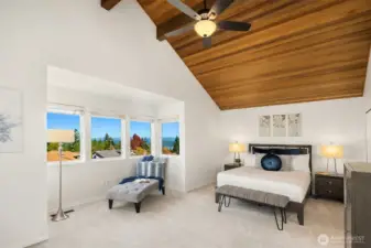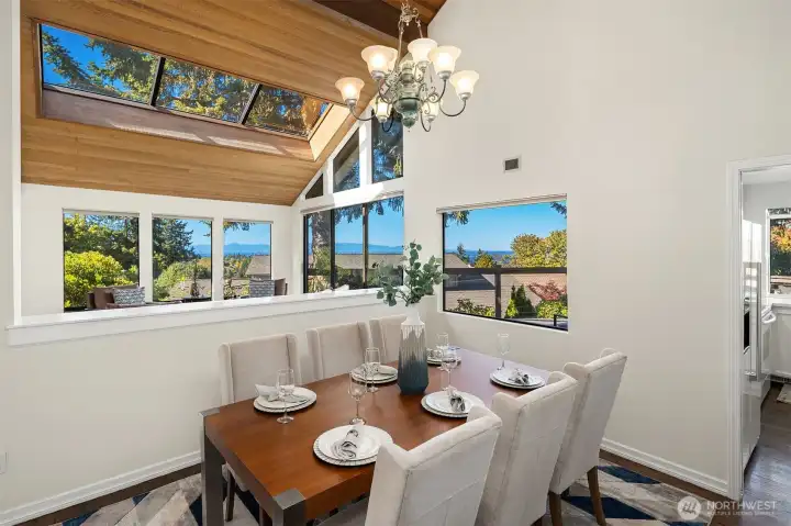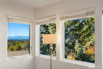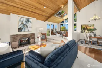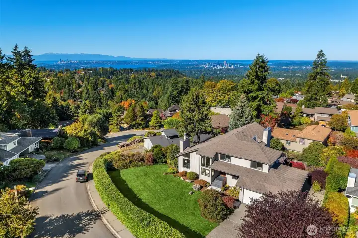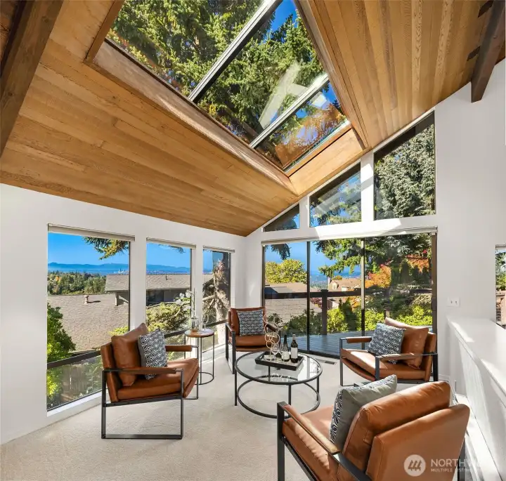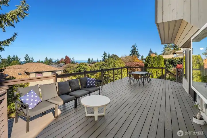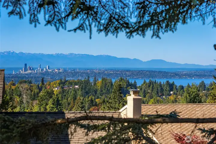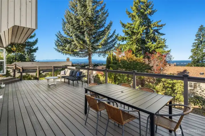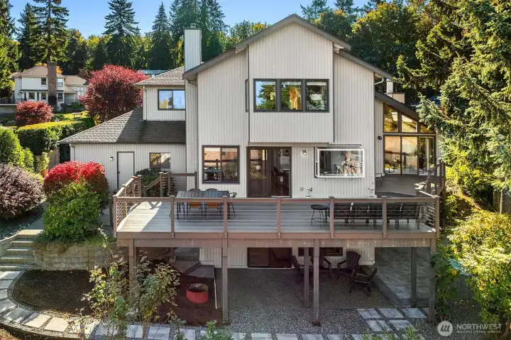 Sundrenched Northwest contemporary with city, lake & mountain views from many rooms, dramatic wood ceilings & a generous floor plan to check all your boxes. Designed to entertain, the living room opens to the dining room & includes a separate sitting area with a slider to the expansive view deck. The kitchen blends with the family room & extends to the deck. Vaulted primary suite with stunning views & a 5-piece bath. 2 additional BRs & a full bath complete the upstairs. Main floor den/5th BR with a ¾ bath close by. The daylight basement offers flexible living space featuring new flooring, a generous rec room with wet bar, spacious BR, full bath, large storage/wine room, & access to the patio & covered deck with outdoor heaters. New carpet.