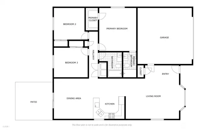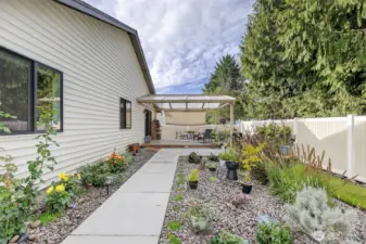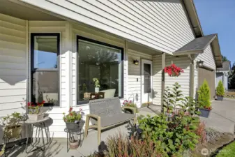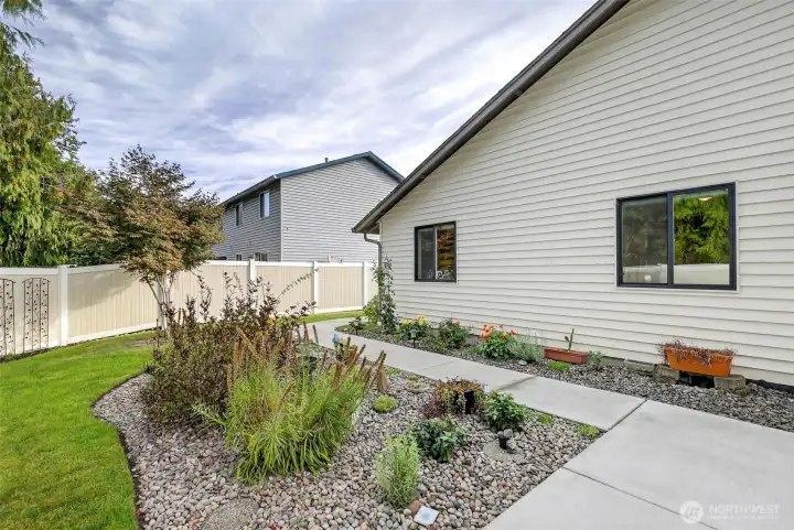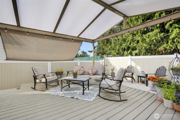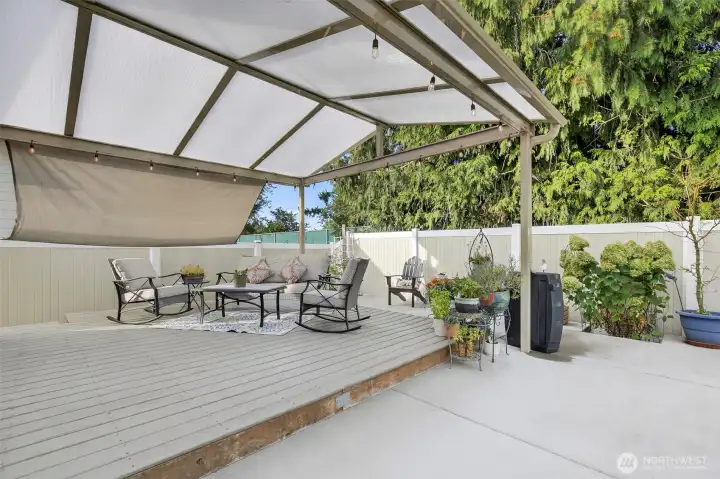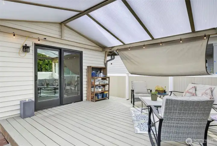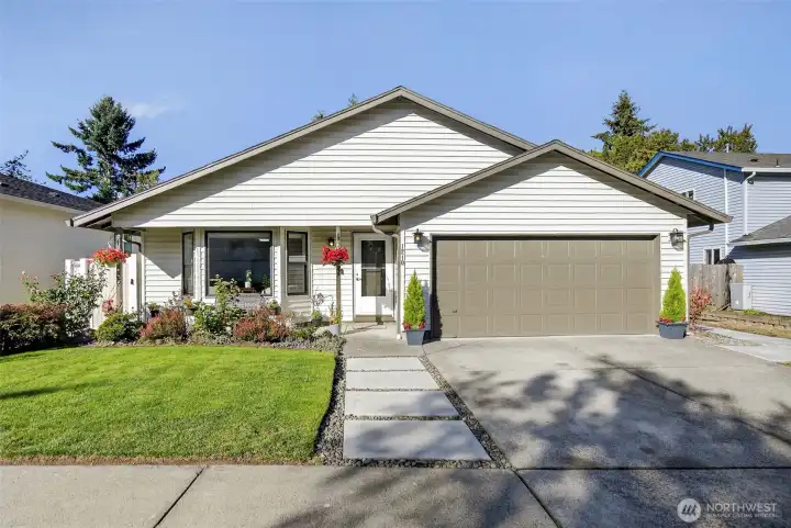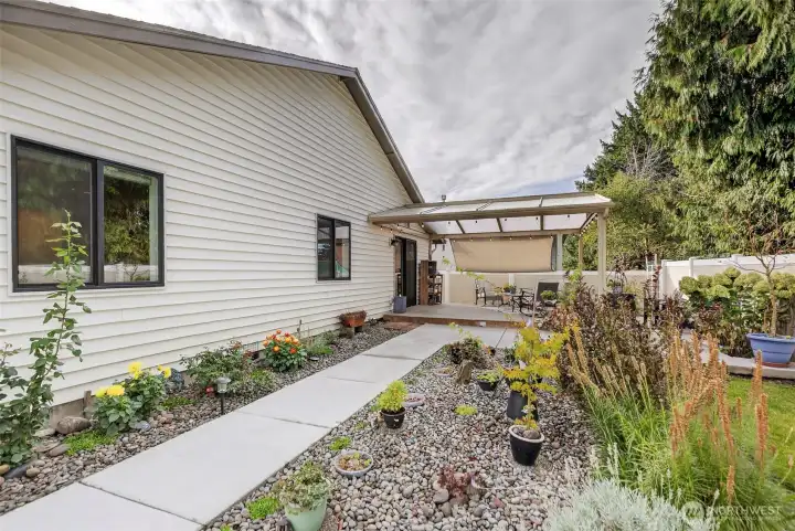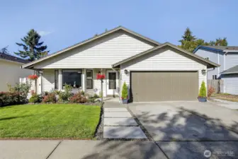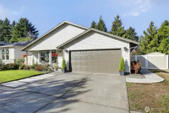 Move-in ready home with thoughtful updates inside and out, including Newer Milgard double pane windows, newer paint! Spacious living room with wall-to-wall newer carpet, and custom blinds. Kitchen features stainless steel appliances, quartz counters, vaulted ceiling, recessed lights, and dining area with slider to backyard. Primary suite offers walk-in closet and remodeled bath with glass shower. Two additional bedrooms plus updated hall bath. Smart thermostat, gas furnace with A/C, and newer gas water heater. Backyard is perfect for entertaining with covered composite deck, acrylite cover, extensive concrete work, and Tuff shed. Roof approx. 10 yrs. Garage includes shelving, opener with keypad.