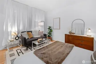 Exceptional value in desirable Lower Queen Anne/Uptown. Vibrant in-city living at the Strathmore Coop, one block to Seattle Center & Climate Pledge Arena, near SIFF Cinema. Charming studio: light-filled from oversized, south-facing windows, dramatic ceilings & refinished fir floors. Maximize living space: Murphy bed alcove, 2 walk-in closets. Kitchen w/space for dining table & chairs. Secure bldg, 100% owner occupied, bike storage, private storage locker, shared laundry. Low HOA dues incl property taxes & W/S/G. RPZ available. Great vibe: walk to Met Market, dining & cafes, easy transit to downtown & SLU. RZP parking available. Excellent in-city home or pied-à-terre. New price=unparalleled opportunity! Secure this gem before the holidays.