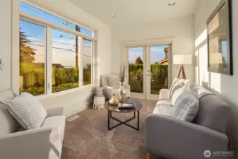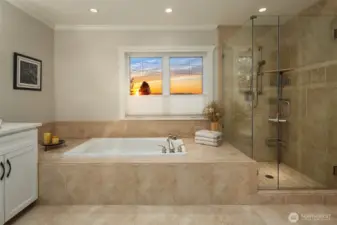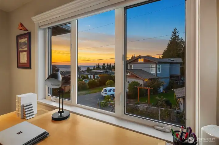 Edmonds Bowl West-facing 4-bed view home perched for privacy & sweeping sunset views. Blending timeless charm w/ modern livability. Thoughtful millwork, hardwoods & airy spaces w/ effortless flow. Soaring ceilings, walls of windows & built-in media center. Chef’s kitchen w/ large quartz island, SS appl & French doors to outdoor entertaining. Custom wine nook w/ quartz serving station. Formal dining & living w/ tray ceilings & gas fireplace. Multiple patios, firepit, lush mature landscaping & fully fenced yard. Luxe primary suite w/ Olympics, Whidbey & Sound views + spa-inspired 5-pc bath. All baths updated. $10k Smart Hunter Douglas blinds. Detached 2-car garage & ample parking. Walkable location near shops, dining, waterfront & ferry.