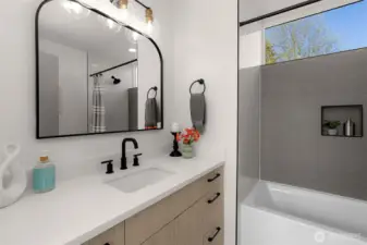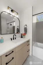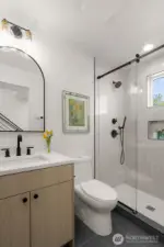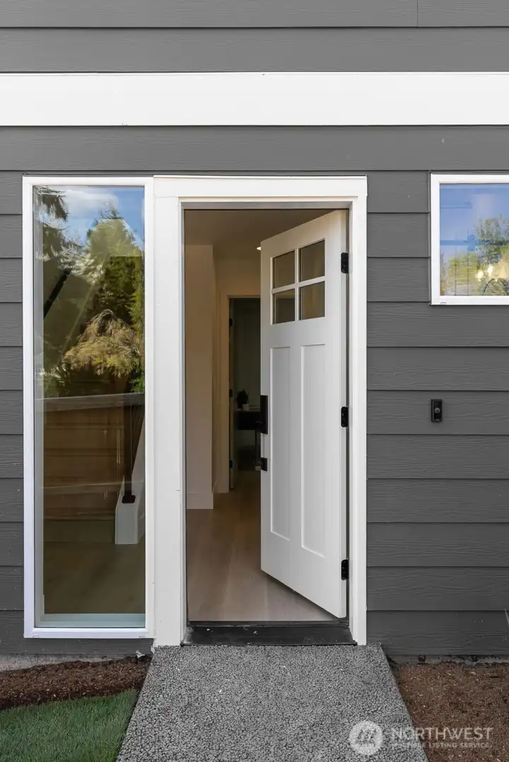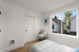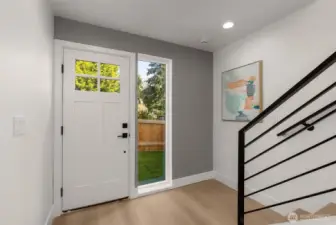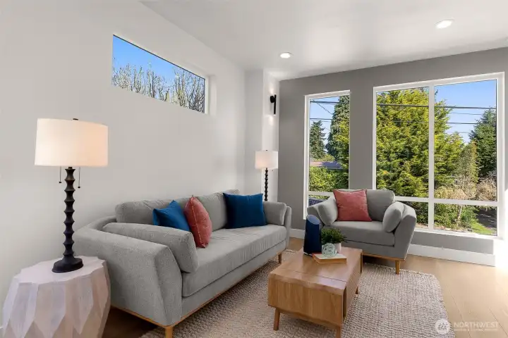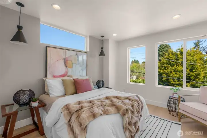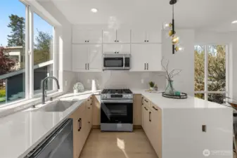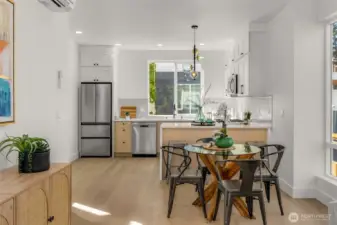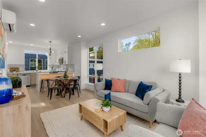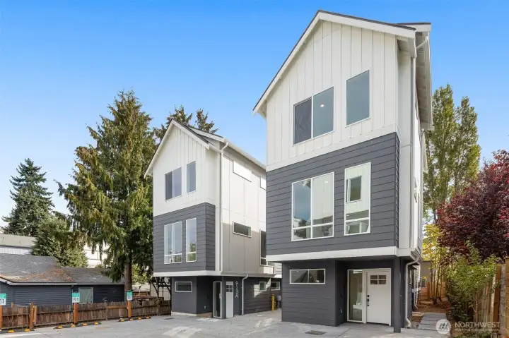 Welcome to your brand-new Greenwood home! This 3-bed, 2.5-bath modern residence stands out for its quiet middle-unit location, abundant natural light, and attractive floorplan. An open, sun-filled layout flows to a sleek kitchen with quartz counters and premium appliances. Primary suite with two additional bedrooms offers flexible space for home offices and guests. Enjoy year-round comfort with mini-split heating/cooling, dedicated off-street parking with EV charger, and enhanced security lighting for peace of mind. Minutes to parks, coffee shops, and transit, this never-lived-in home blends thoughtful design with a builder’s warranty and quick access to Seattle’s tech hubs.