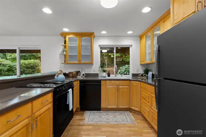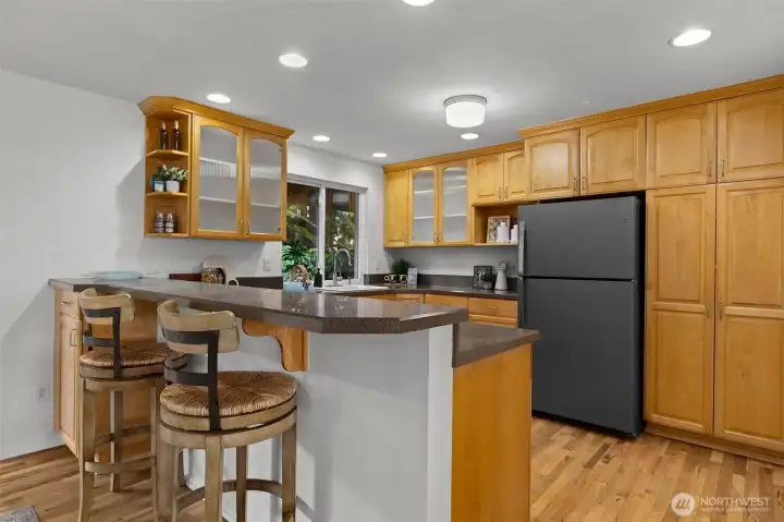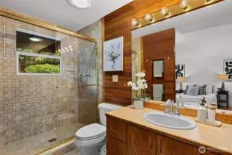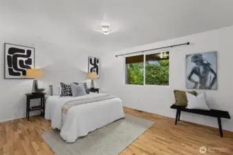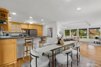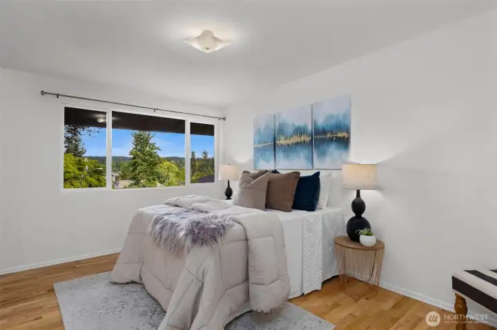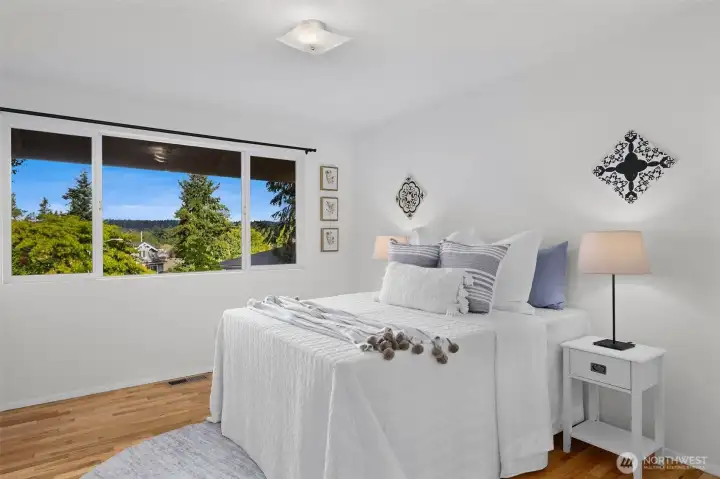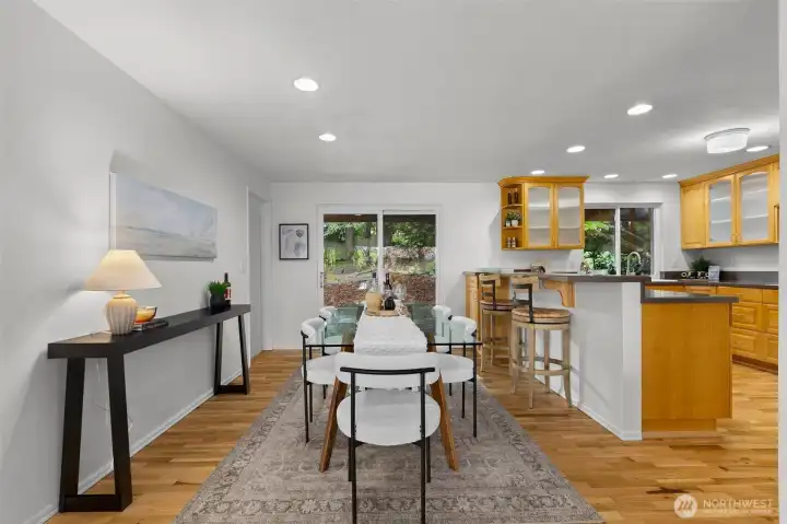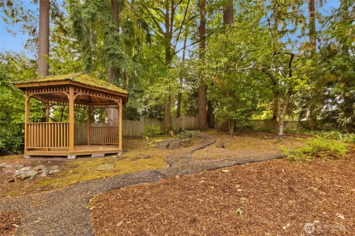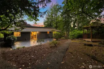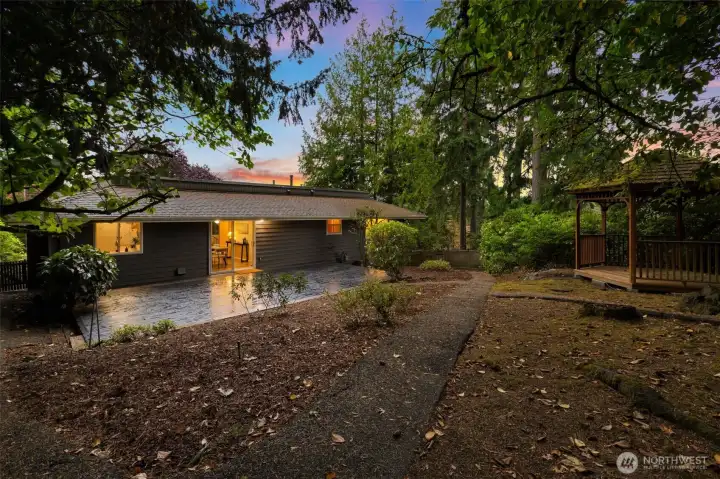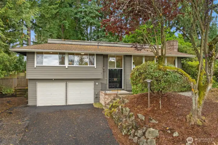 Nestled at the end of a quiet cul-de-sac in West Bellevue, this mid-century gem offers a serene retreat on a large .24-acre lot. Oversized windows brighten the living room, where hardwood floors and a brick fireplace evoke timeless warmth. The dining room extends to a spacious Ipe deck overlooking the private backyard with a charming gazebo. The kitchen with breakfast bar lends itself to casual gatherings, while the primary suite enjoys tranquil views and its own bath. Downstairs, a versatile space with Murphy bed adapts easily as a 4th bedroom. With fresh updates and a prime location just steps from Clyde Hill Elementary and minutes to Bellevue Square, downtown parks, and freeways, this home embodies the ease and allure of Bellevue living.