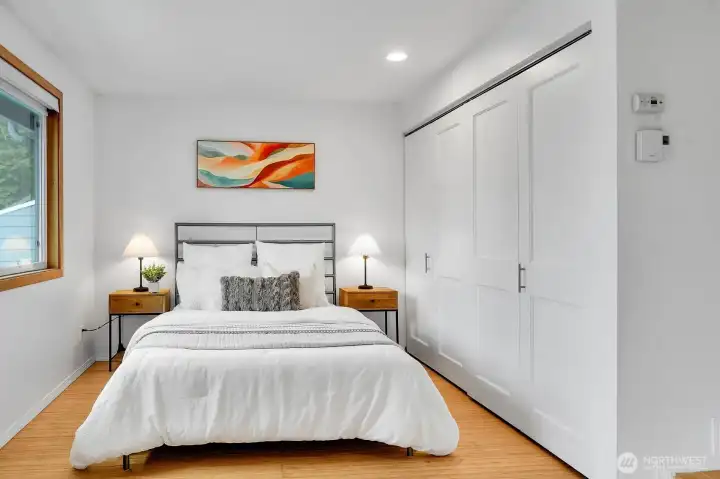 Peer out over evergreens from this serene top-floor condo. Vaulted ceilings with warm wood accents create an airy great room that opens to a spacious porch through sliding glass doors—perfect for indoor/outdoor living. Renovated with bamboo floors, quartz counters, modern cabinetry, fresh paint, and an updated bathroom, this home is truly move-in ready. Features include 2 bedrooms, 1 bath, a wood-burning fireplace, sports court, and a deeded covered parking space with ample guest parking. Centrally located near Redmond’s best eateries, Marymoor Park, and miles of trails along the Sammamish River, this condo offers the perfect blend of comfort, convenience, and lifestyle.