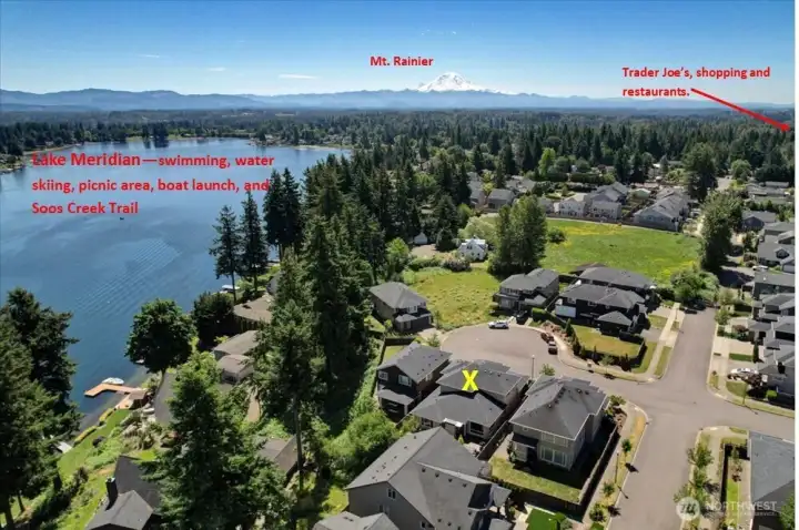 Well maintained, better than new, 9 yr old MainVue home situated on a quiet cul-de-sac with peek-a-boo views of Mt. Rainier and Lk. Meridian! Relax on the covered deck with fireplace overlooking your beautifully landscaped backyard with gazebo knowing you have a newer furnace and A/C unit and $12K in custom window treatments. Oversized windows for plenty of natural light. Main level primary suite with 5-fixture bath and walk-in with $8K Calif. Closet system. Spacious kitchen with walk-in pantry, S/S appliances, den, utility room with "Costco" closet and half bath complete the main floor. Upstairs is a huge bonus room, 3 additional bedrooms with walk-in closets and a full bath. Close to shopping, restaurants, Trader Joe's and Lk Meridian.