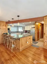 Omak - Private Road/Dead End Street - Almost 1 acre! 5 Bed/1.75 Bath Beautiful craftsman home w/cascading stairway to front door & exterior deck. Knotty pine details throughout entire home. Main level incls oversized living room w/wood burning fireplace & brick accent wall, cabinets w/passthrough wood box for easy access! Kitchen w/huge island - upper & lower cabinets & laundry/utility room w/exterior exit to side covered patio. Primary bedroom & three-quarter remodeled bathroom. Additional room w/separate entryway. Upper level incls 3 additional bedrooms & full bathroom.Downstairs has additional finished living room & wet bar. Huge storage room & canning room. Attached one car garage. Heat pump. City utilities. $420,000. H-3723/MLS2441032.