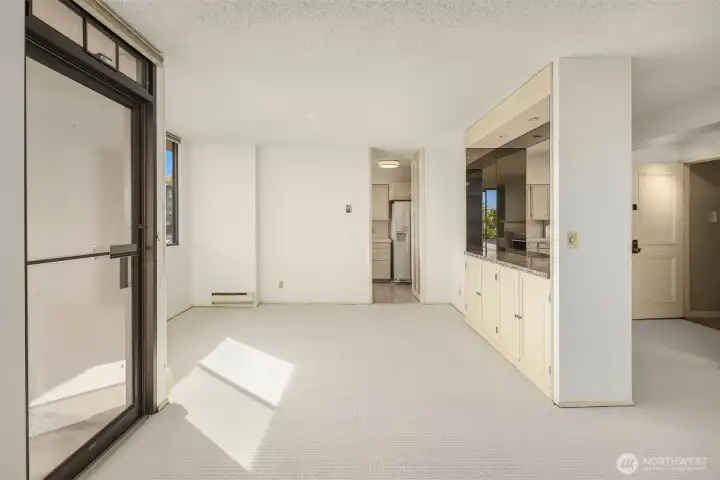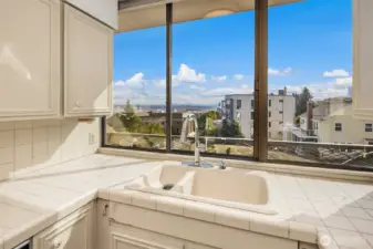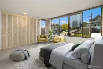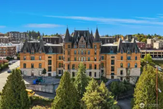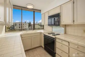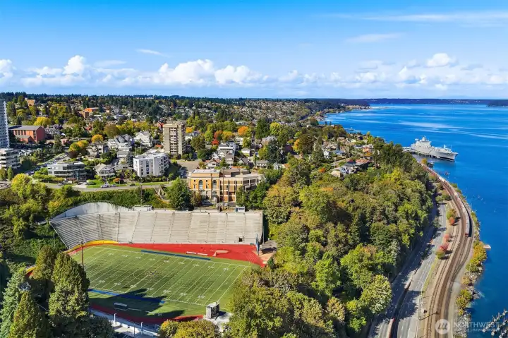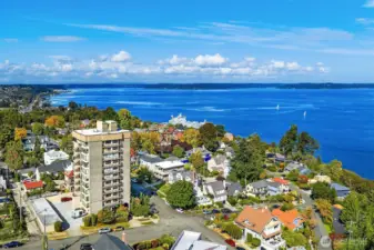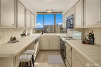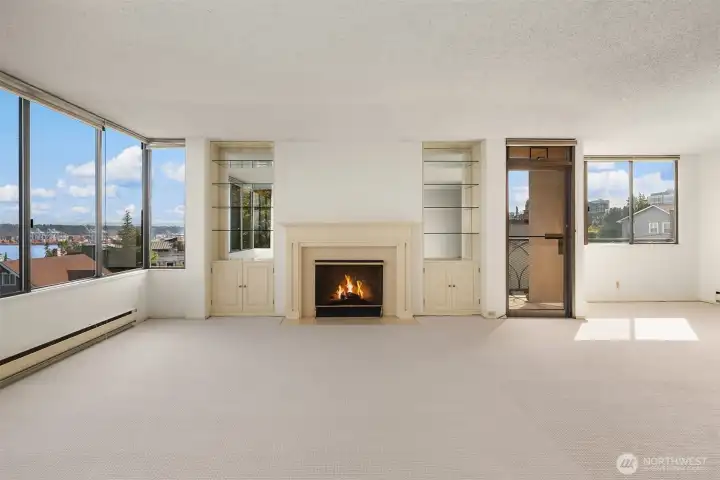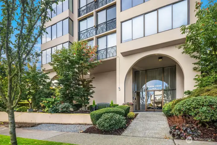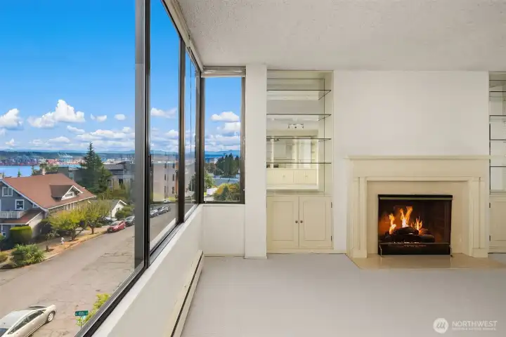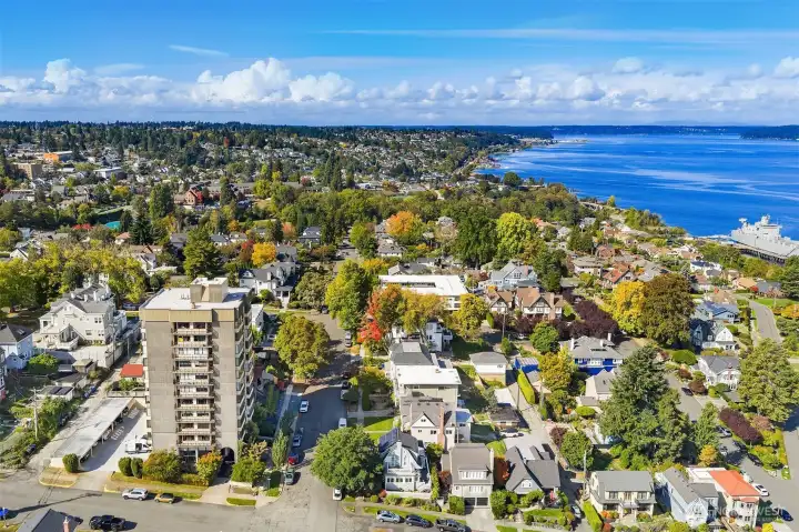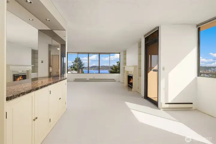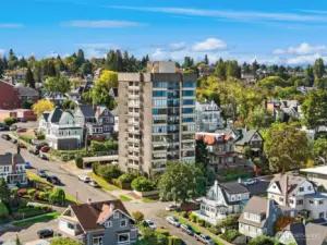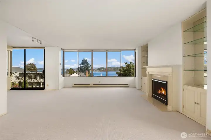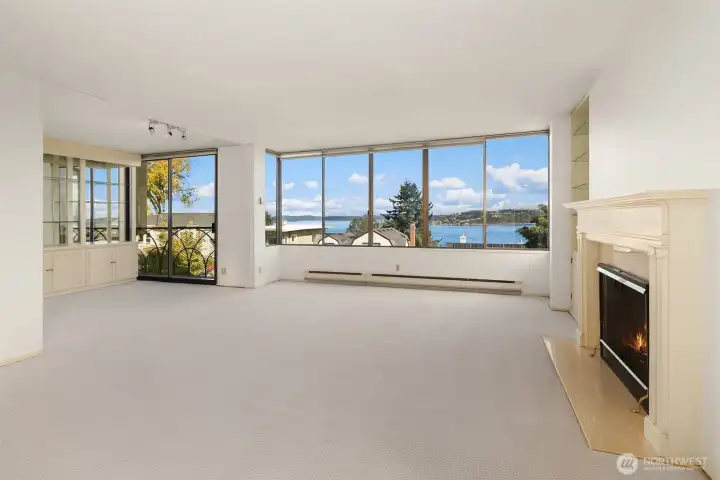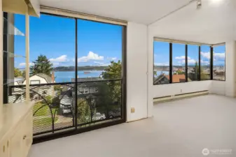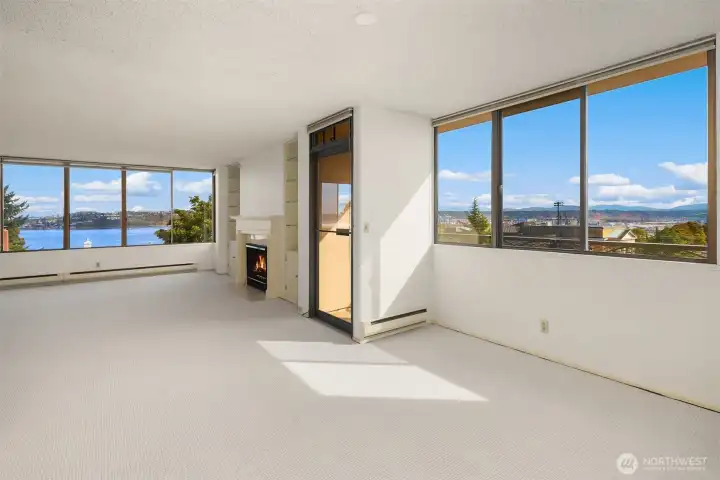 First time on the market! This rare Plaza Four residence spans the entire S side of the building, offering privacy w/only one other unit on the floor. Featuring 2BD+DEN /2BA showcasing sweeping 180° views from Vashon to Mt Rainier through walls of windows & 3 private balconies. The flexible layout includes a spacious living/dining w/fireplace, primary w/walk-in closet, & large 2nd BD/versatile den. Freshly painted w/new carpet, it’s move-in ready yet primed for a remodel to reflect your style. Amenities incl secure access w/onsite manager, clubroom, exercise, sauna, common patio, guest parking, plus a convenient pull-through drive. Ideally located in the walkable Stadium District near shops, dining, hospitals, transit, & light rail.